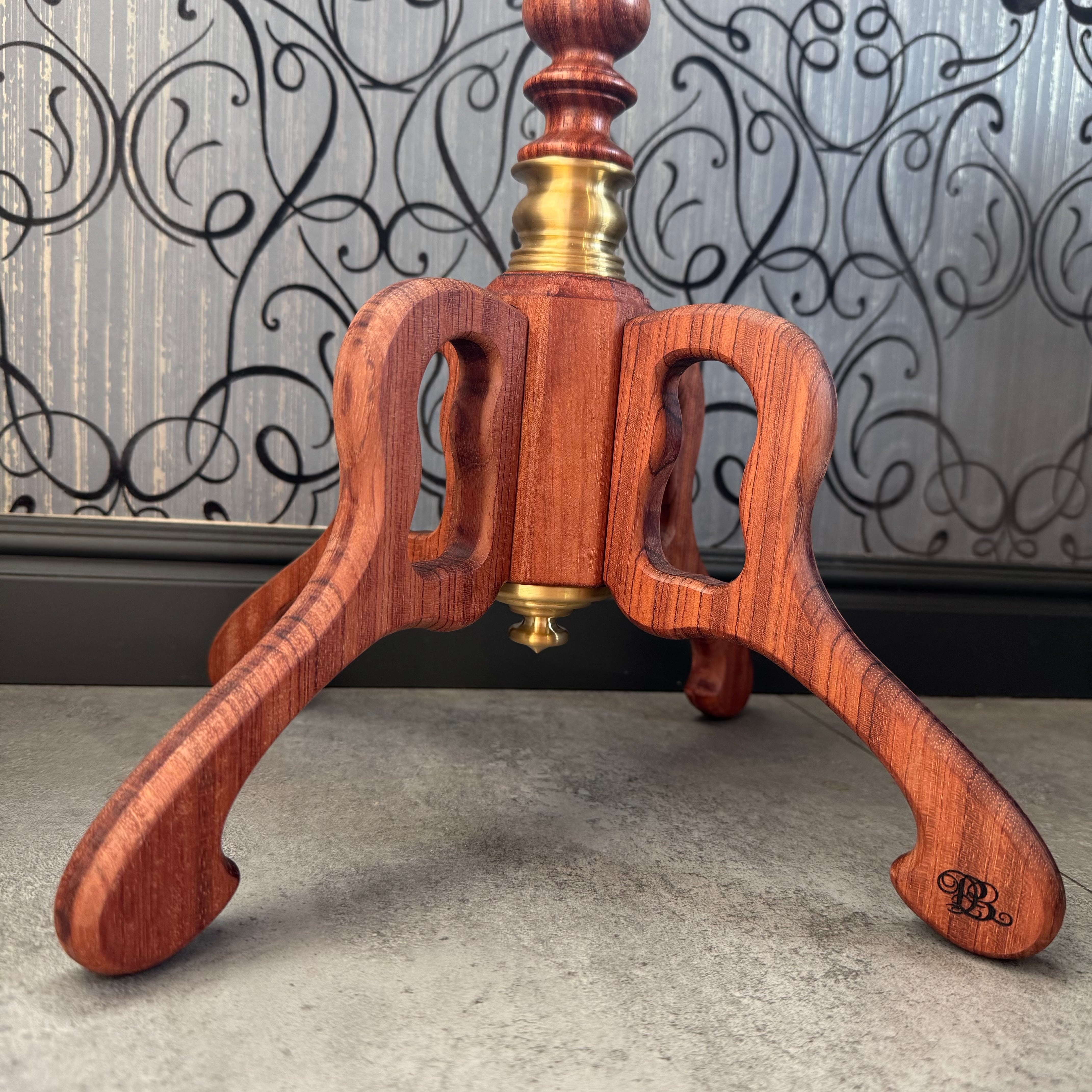 足はRでデザインし、中を抜く事で、スッキリとしたバランスに仕上げました。贅沢に直径55の 真鍮を削り出しで装飾且つ、重心を下にし安定感も重視しました。
