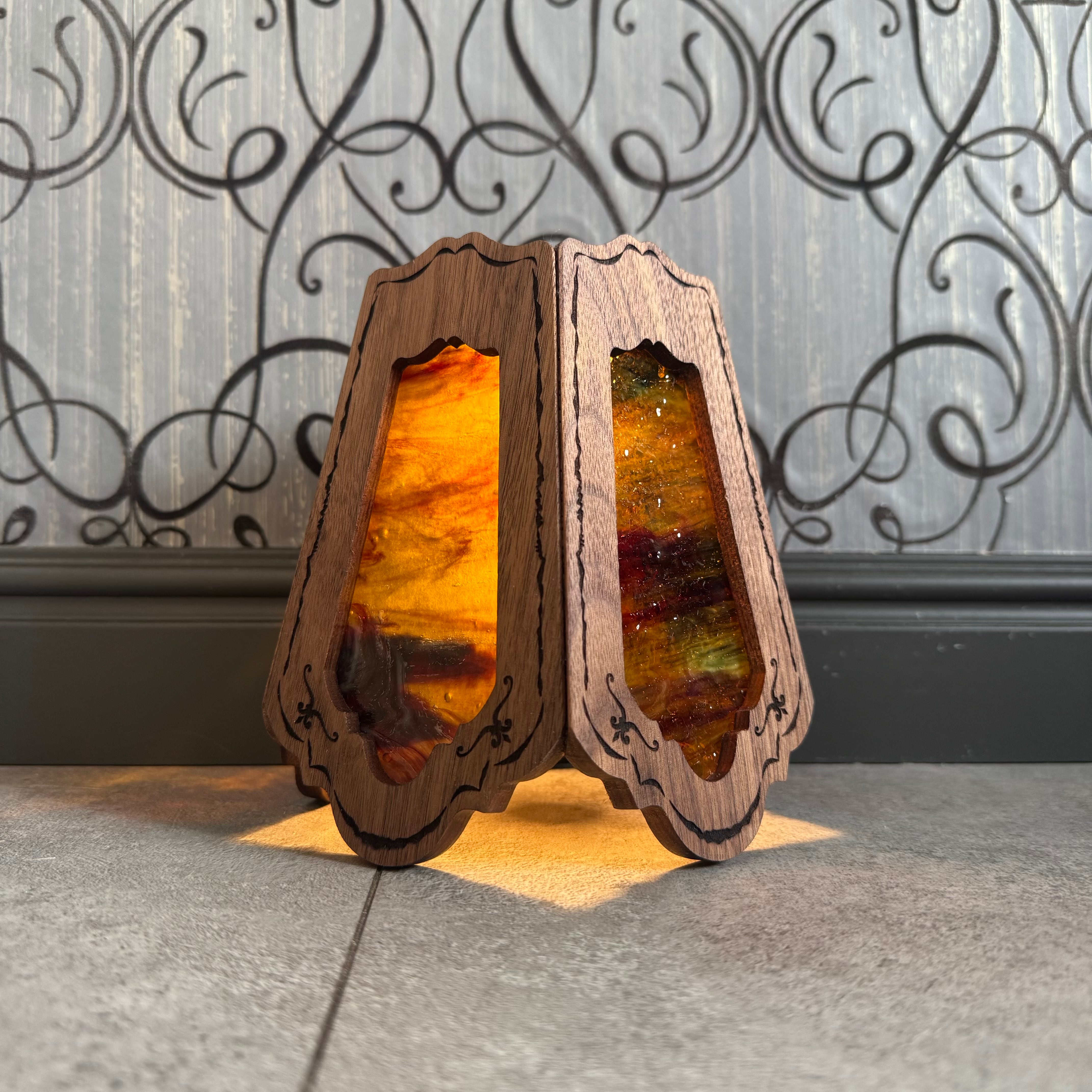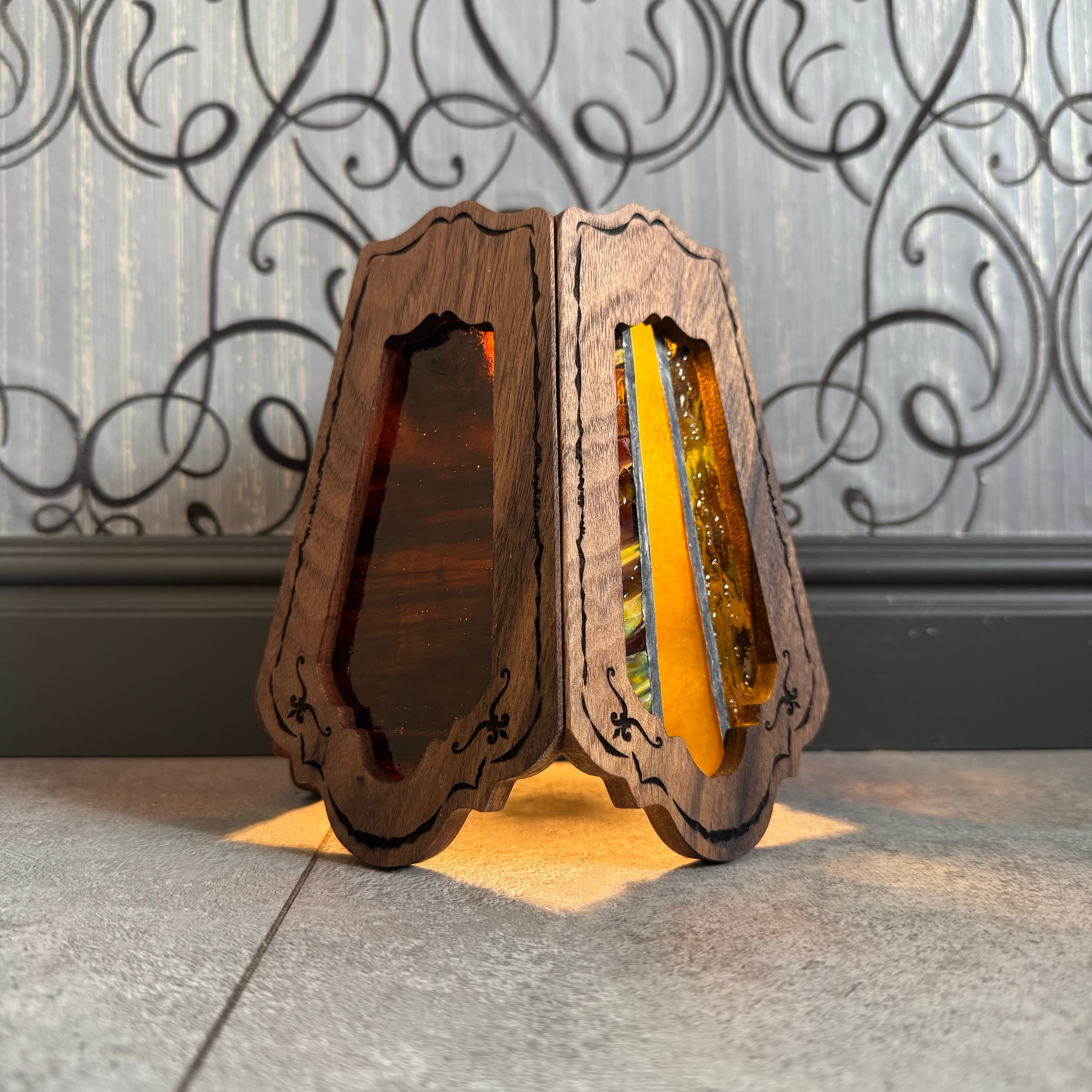 ステンドグラスの部分は交換できる仕様になってますので、テントコーデに合わせて変更できます。ガラスはトンボで固定されているので、持ち運ぶ際はガラスを外して運べます。
