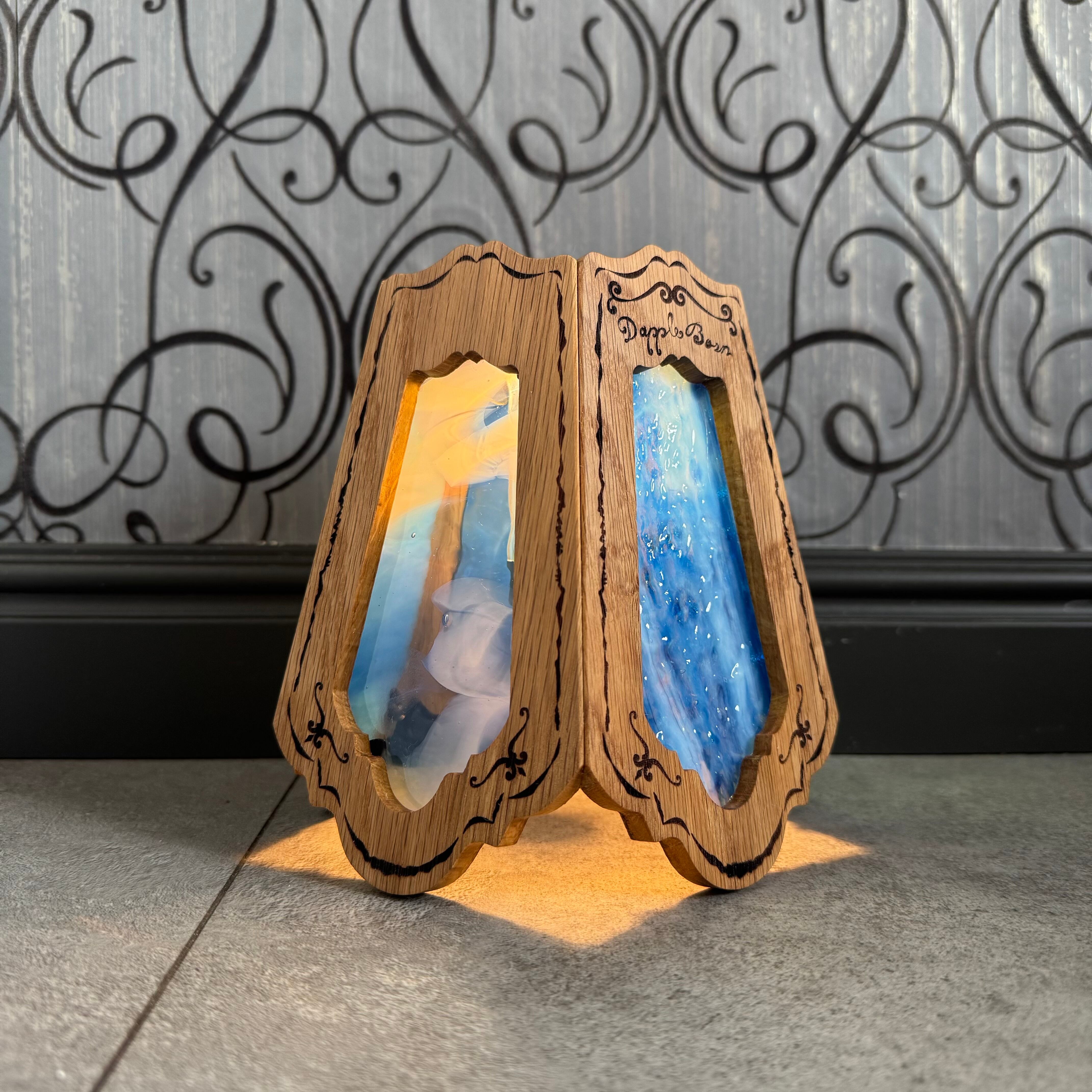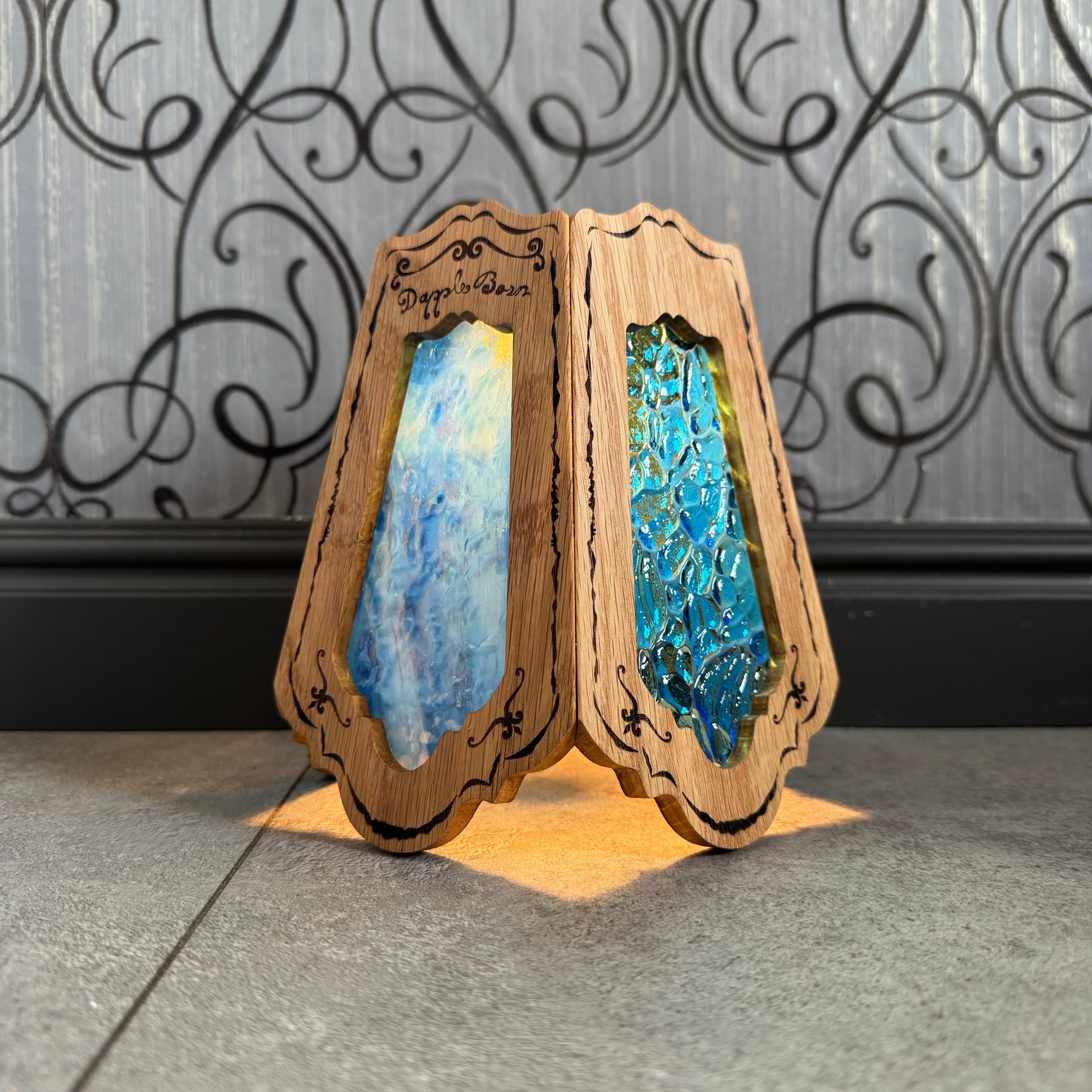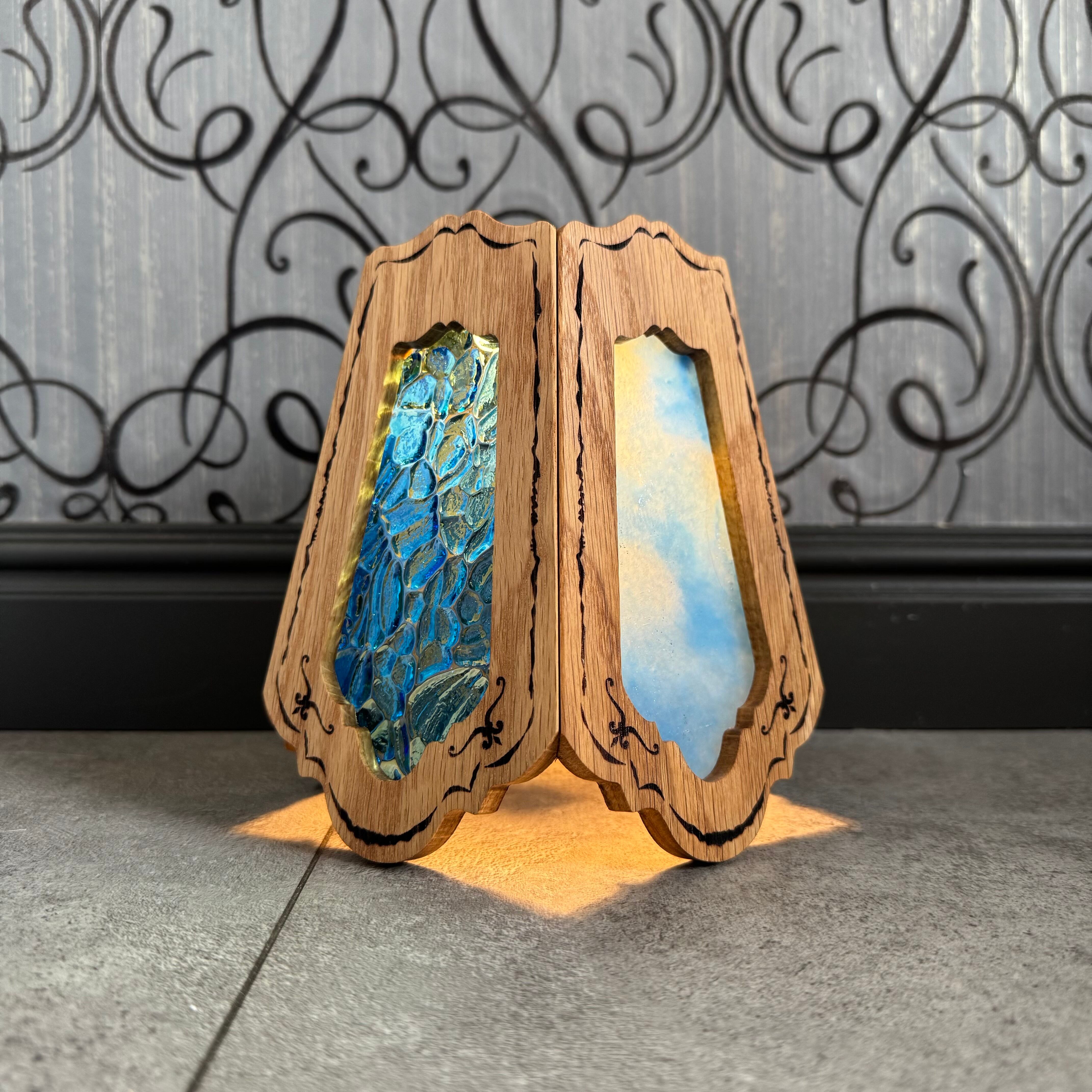 ステンドグラスの部分は交換できる仕様になってますので、テントコーデに合わせて変更できます。ガラスはトンボで固定されているので、持ち運ぶ際はガラスを外して運べます。