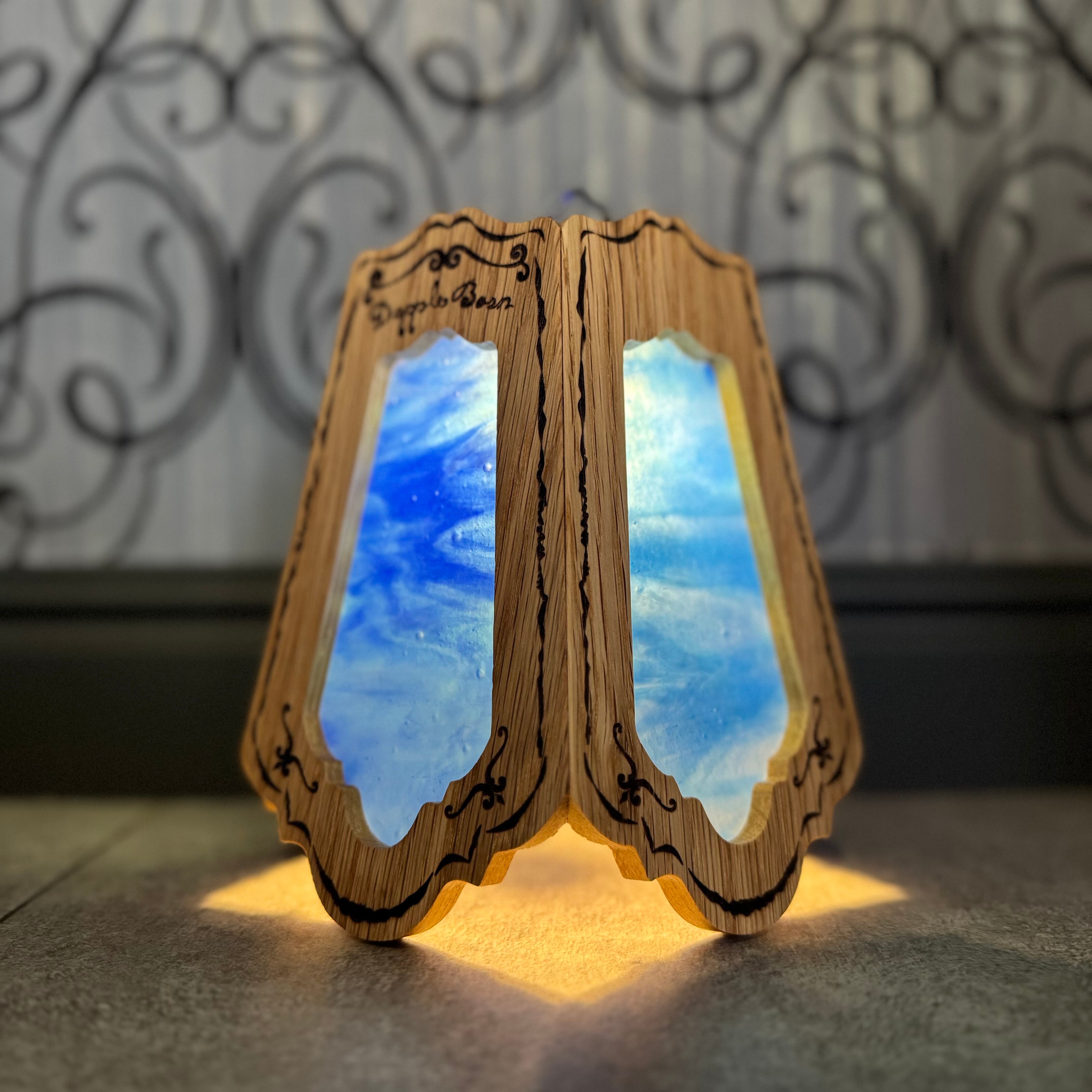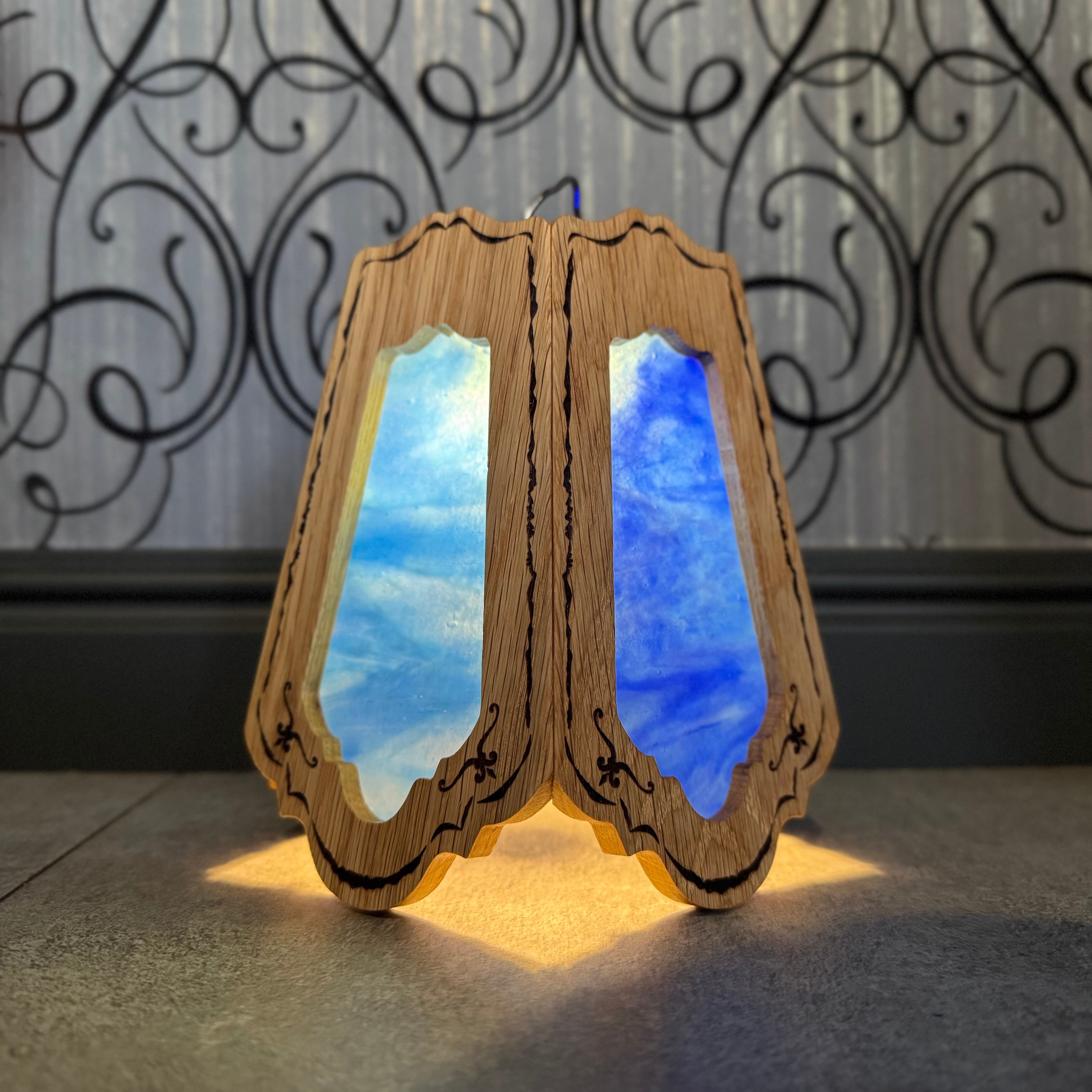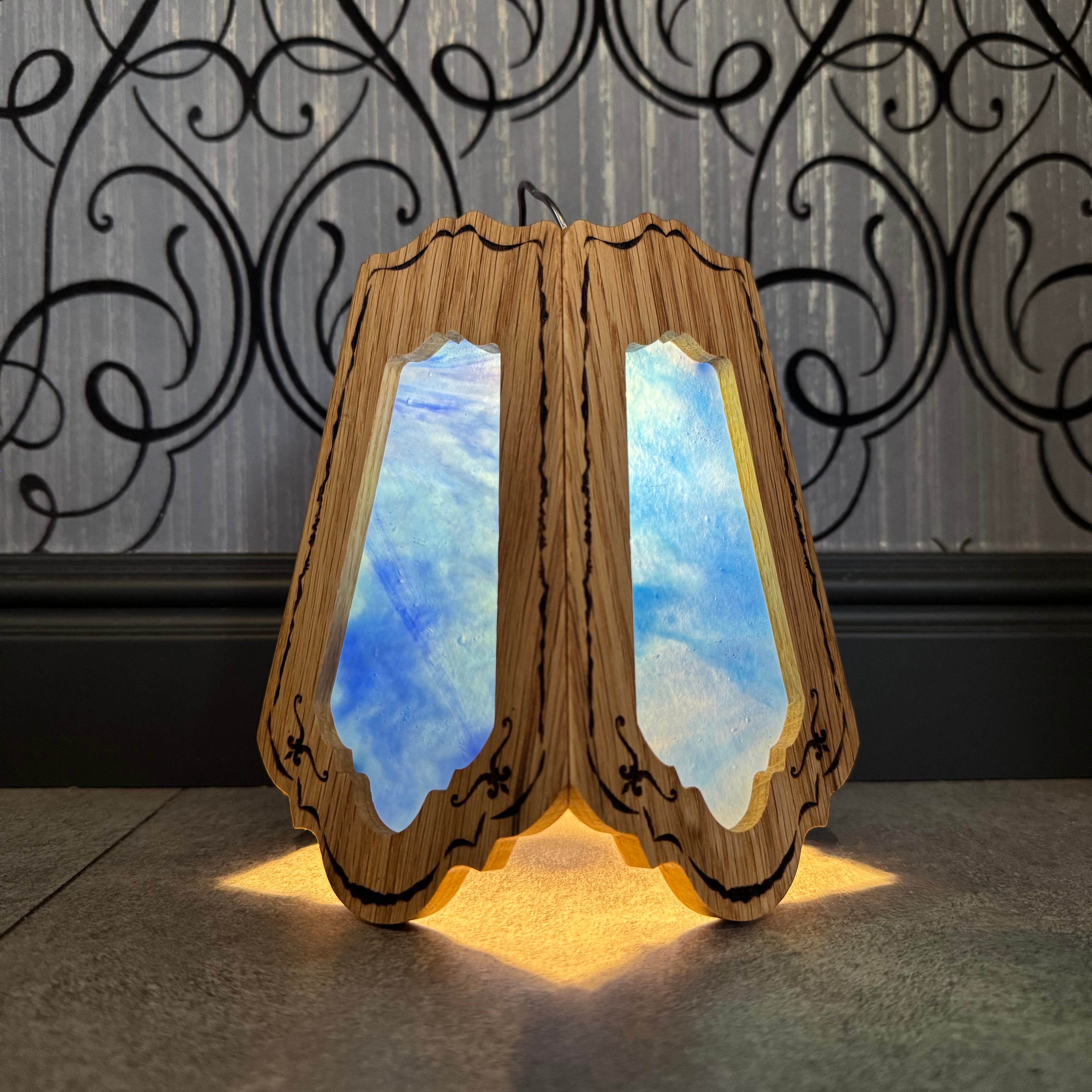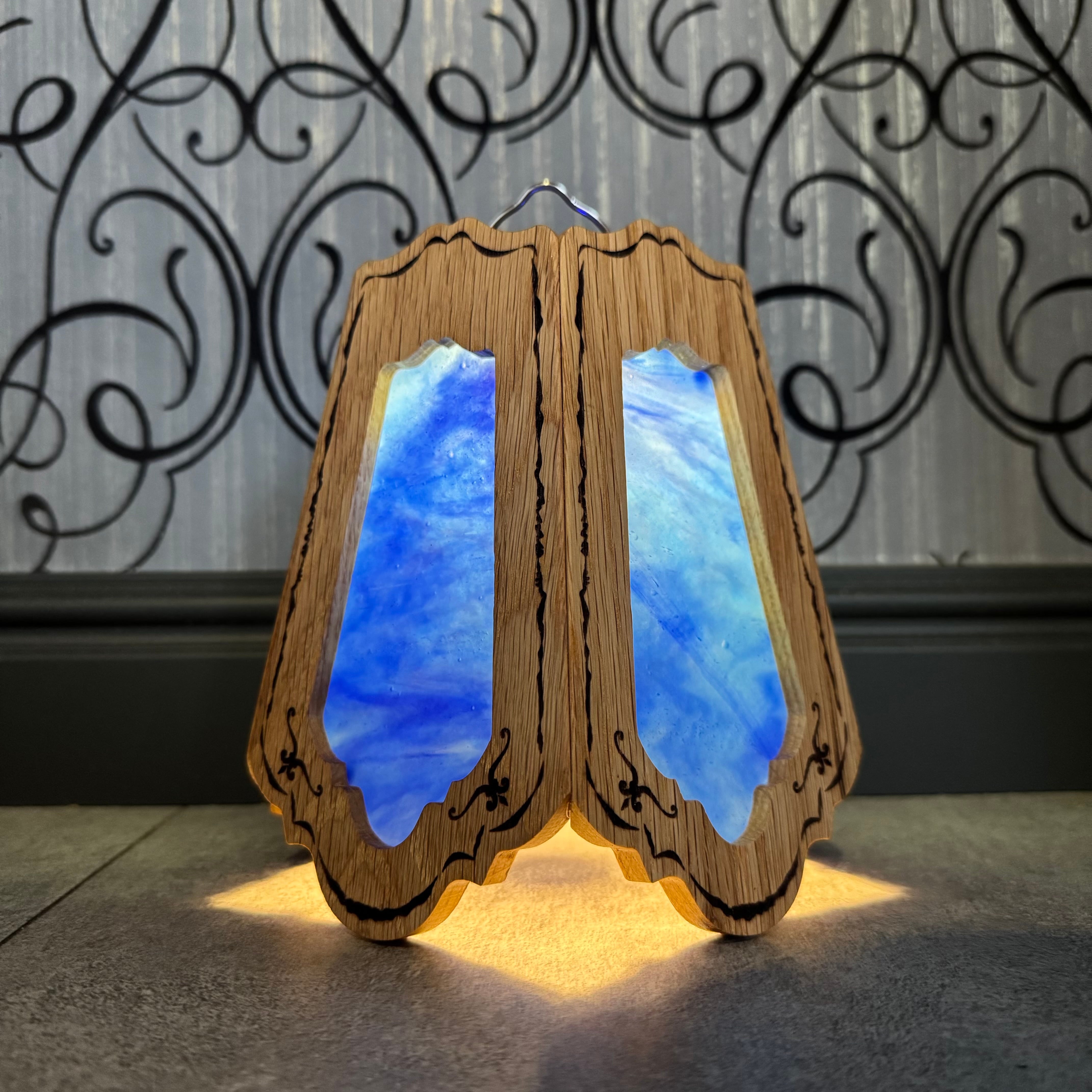 ステンドグラスの部分は交換できる仕様になってますので、テントコーデに合わせて変更できます。ガラスはトンボで固定されているので、持ち運ぶ際はガラスを外して運べます。