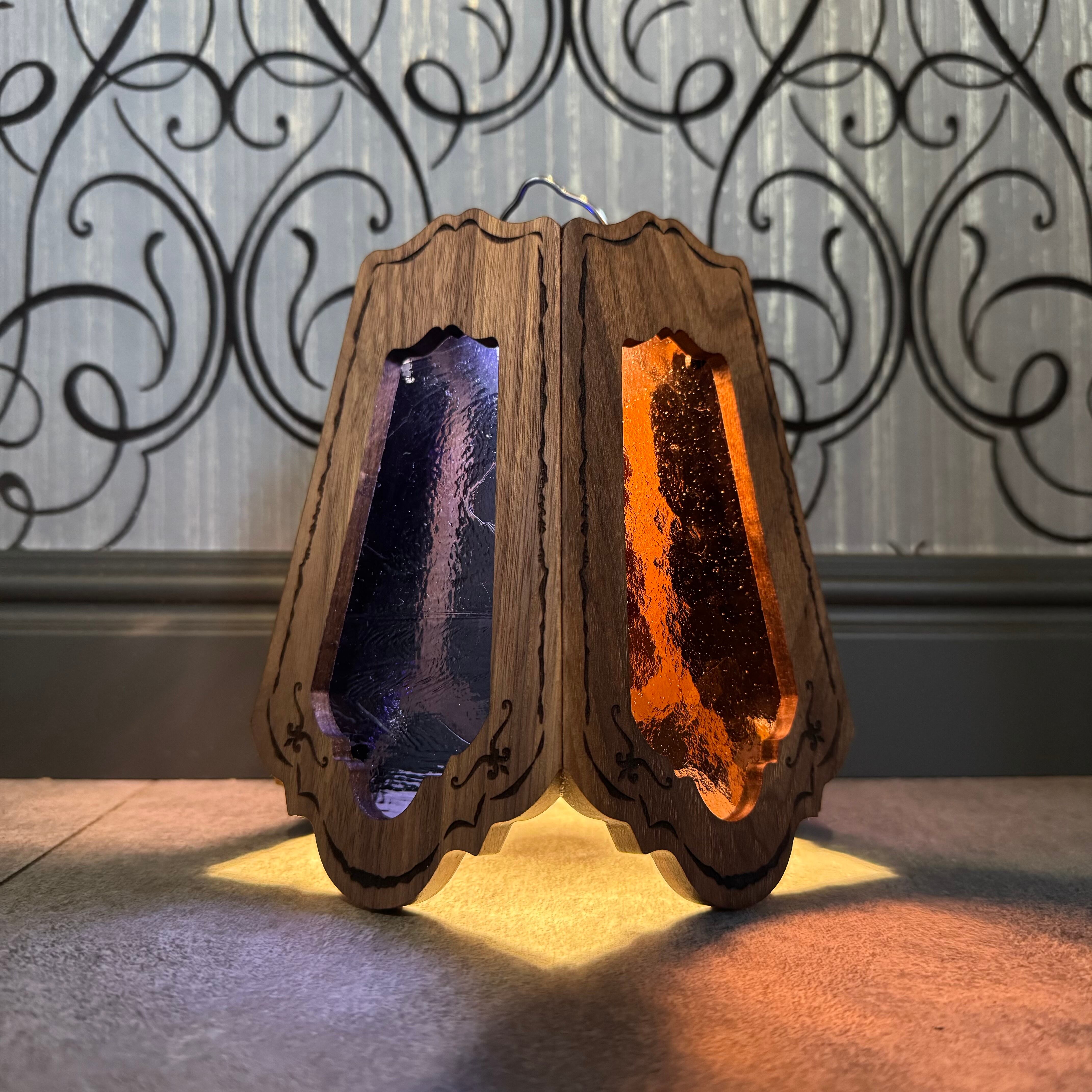 ステンドグラスの部分は交換できる仕様になってますので、テントコーデに合わせて変更できます。ガラスはトンボで固定されているので、持ち運ぶ際はガラスを外して運べます。