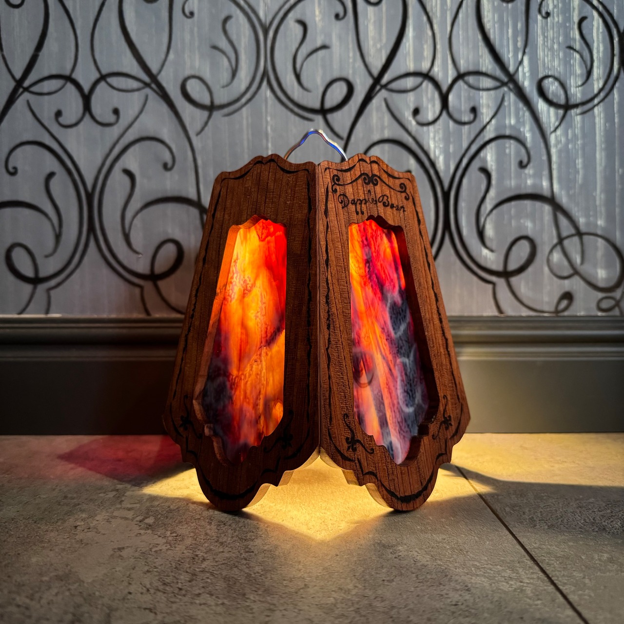 ステンドグラスの部分は交換できる仕様になってますので、テントコーデに合わせて変更できます。ガラスはトンボで固定されているので、持ち運ぶ際はガラスを外して運べます。