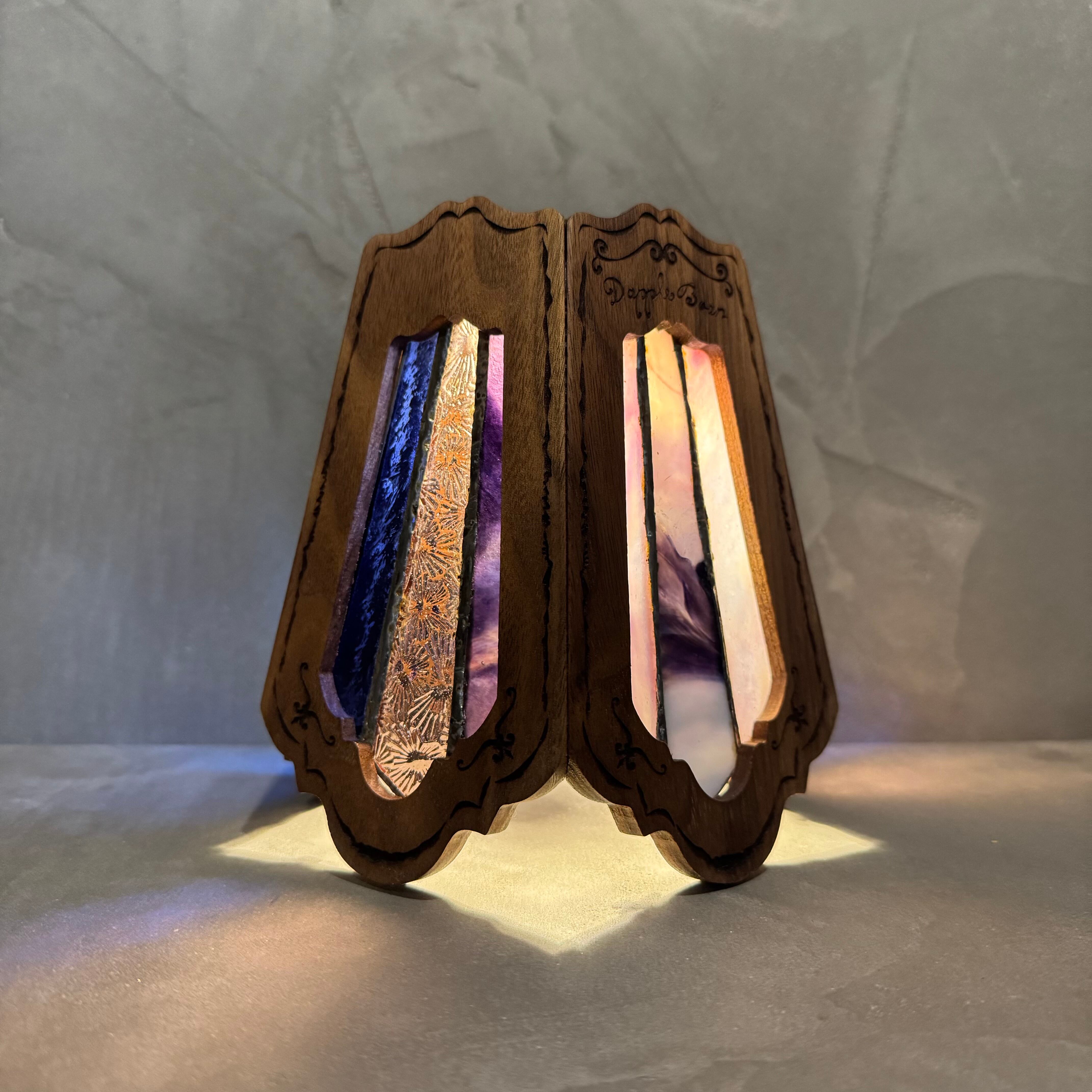 ステンドグラスの部分は交換できる仕様になってますので、テントコーデに合わせて変更できます。ガラスはトンボで固定されているので、持ち運ぶ際はガラスを外して運べます。
