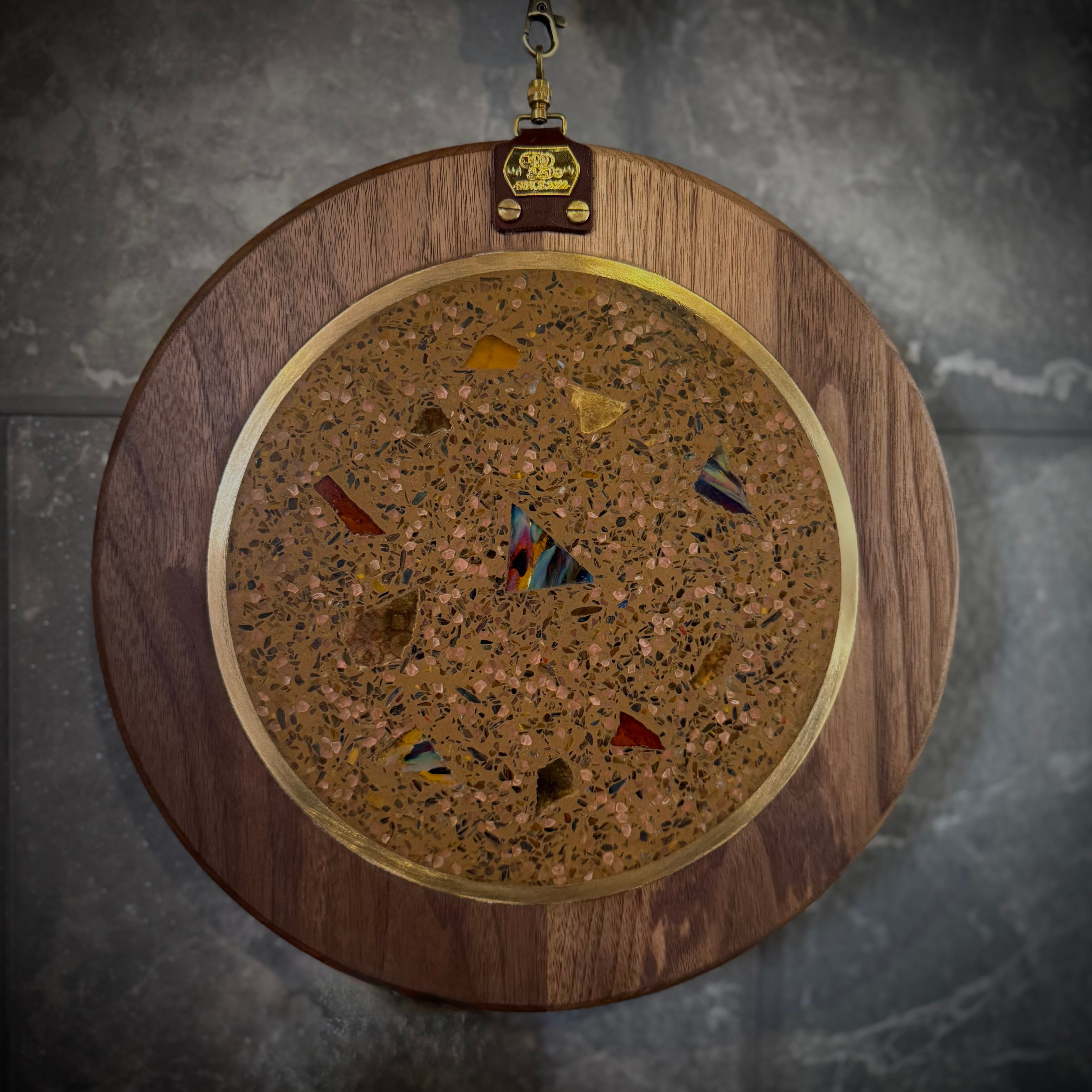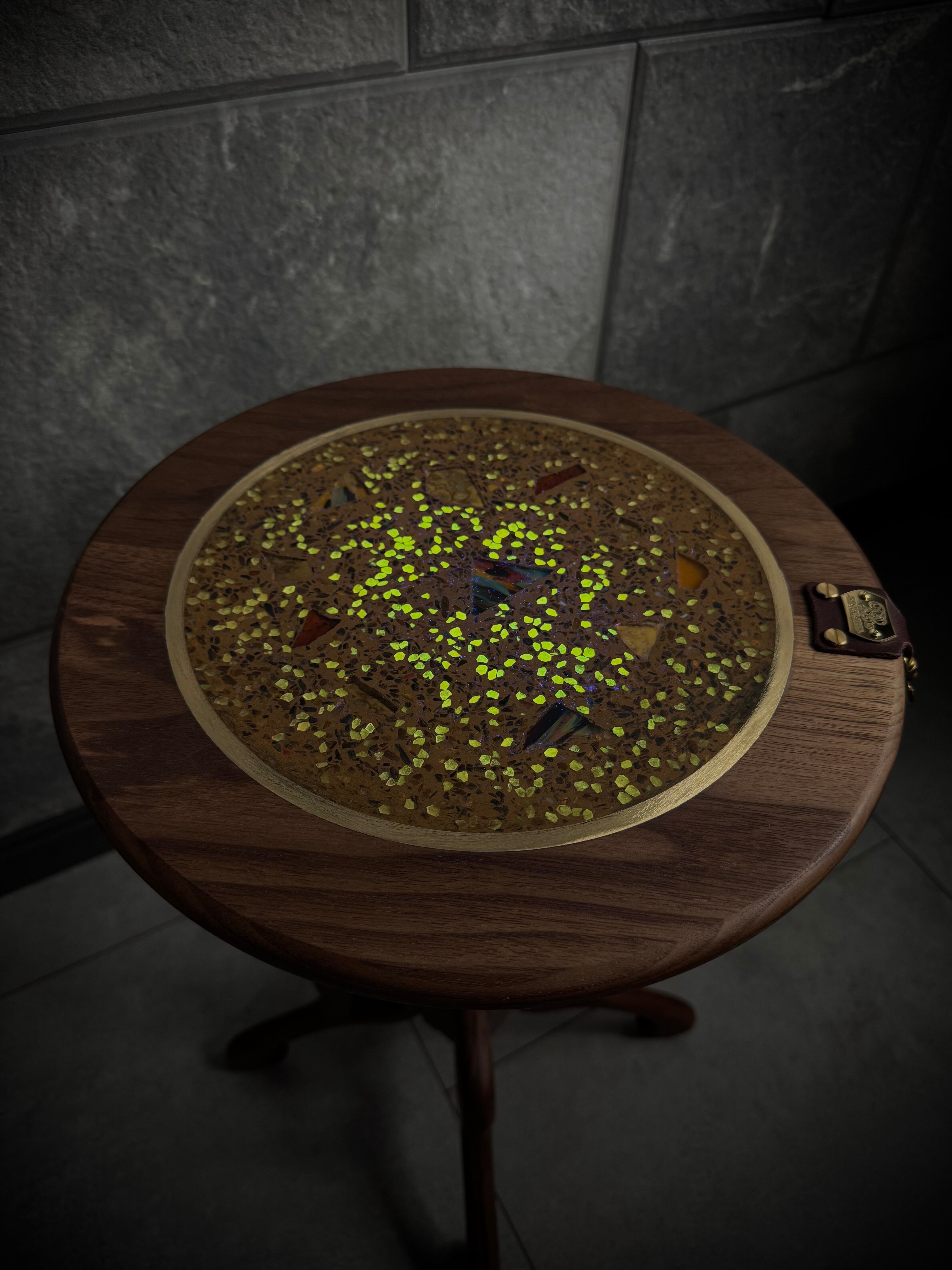 ウォールナット無垢材/真鍮/タイガーアイ/蓄光石イエロー/ステンドガラスアンバー/ゴールドミラー/イタリアンレザー