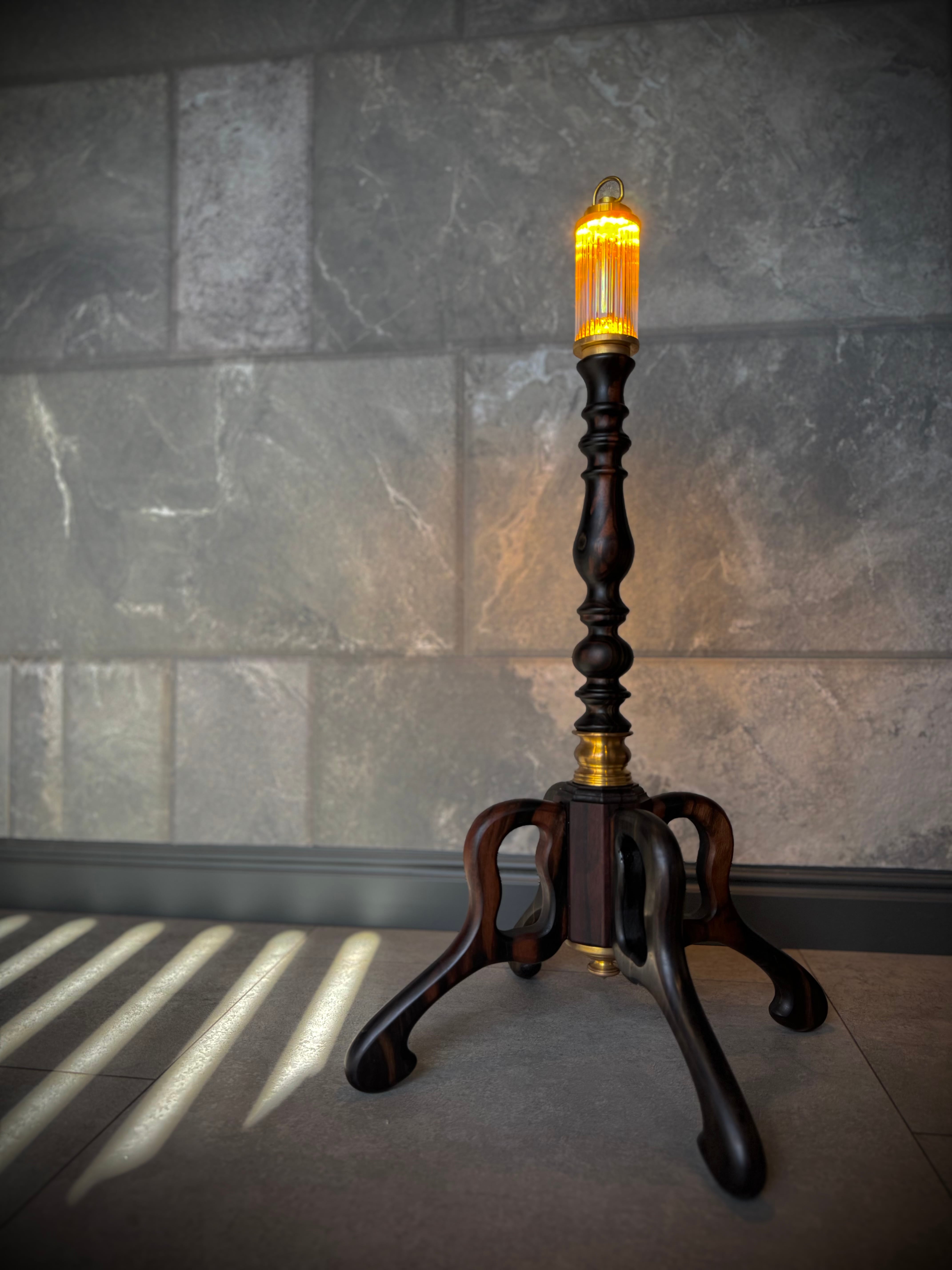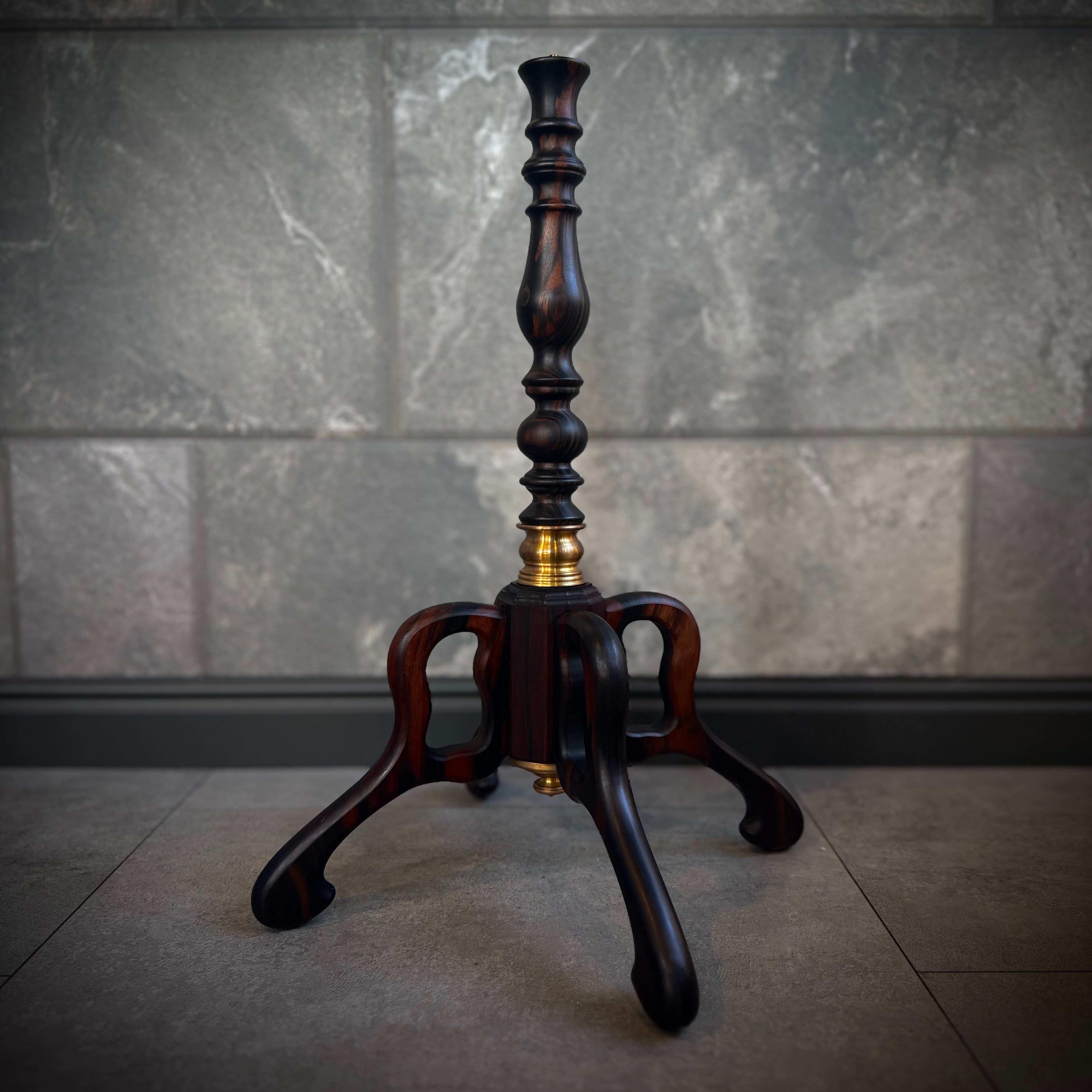 足はRでデザインし、中を抜く事で、スッキリとしたバランスに仕上げました。贅沢に直径55の 真鍮を削り出しで装飾且つ、重心を下にし安定感も重視しました。