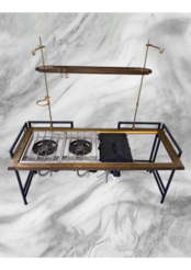 特徴としては、4ユニットはまり2バーナーと調理スペースを十分に確保でき、大型サイズですが脚が自立しますので、設営がとても簡単にできます。フレームの面取りはクラシカル面取り段々にしており、アンティークの雰囲気にしております。2段目に棚も設置する事ができます。収納袋は、オレゴニアンキャンパーさんのグリルテーブルキャリーバックにジャストフィットします。