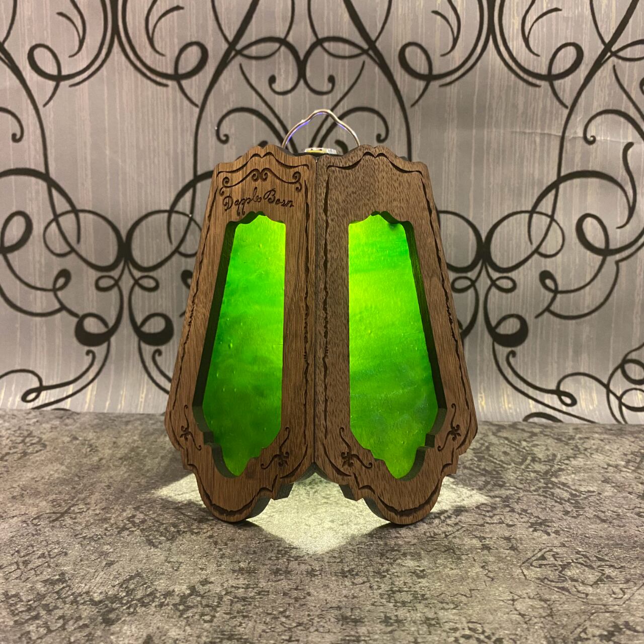 ステンドグラスの部分は交換できる仕様になってますので、テントコーデに合わせて変更できます。ガラスはトンボで固定されているので、持ち運ぶ際はガラスを外して運べます。
