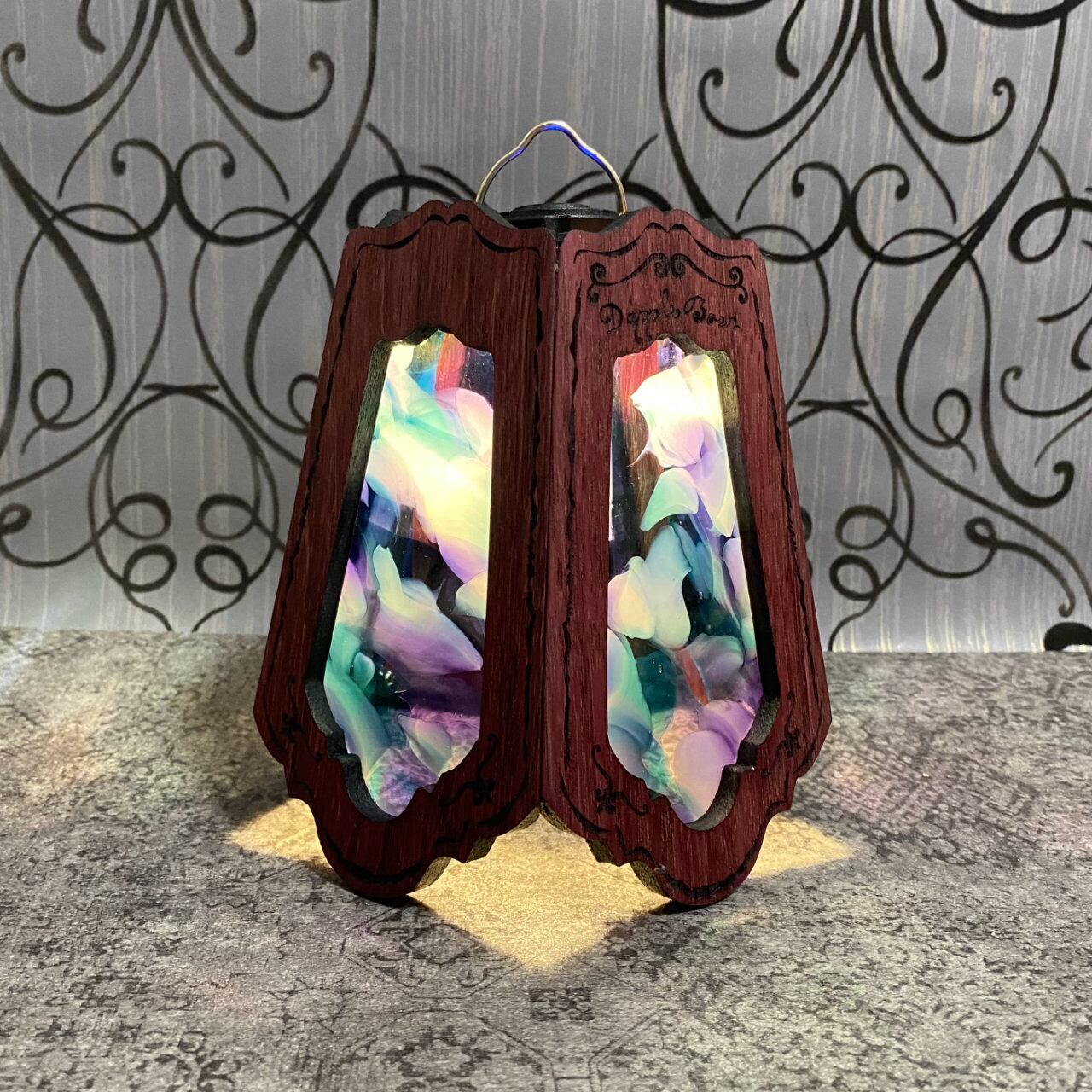 ステンドグラスの部分は交換できる仕様になってますので、テントコーデに合わせて変更できます。ガラスはトンボで固定されているので、持ち運ぶ際はガラスを外して運べます。