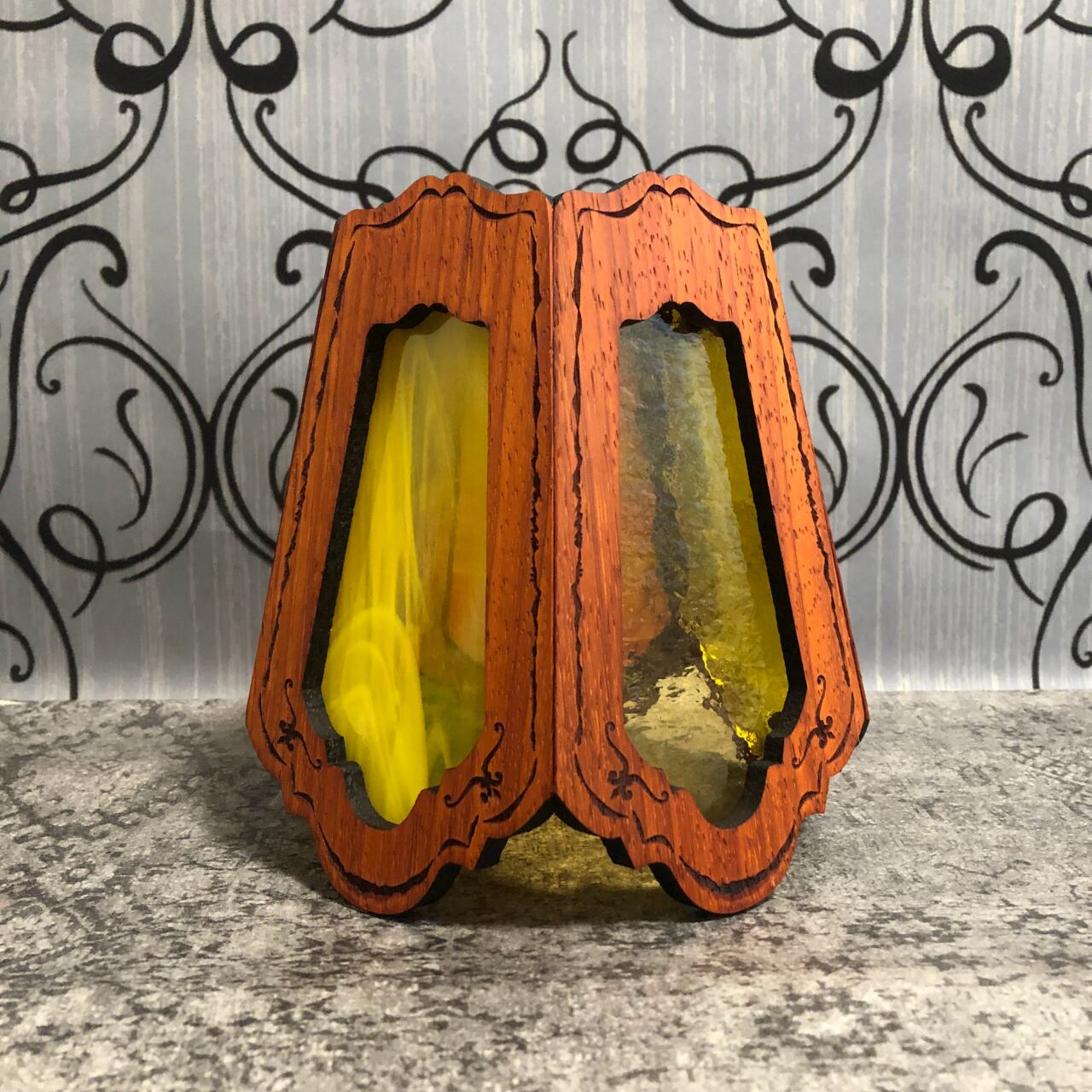 ステンドグラスの部分は交換できる仕様になってますので、テントコーデに合わせて変更できます。ガラスはトンボで固定されているので、持ち運ぶ際はガラスを外して運べます。