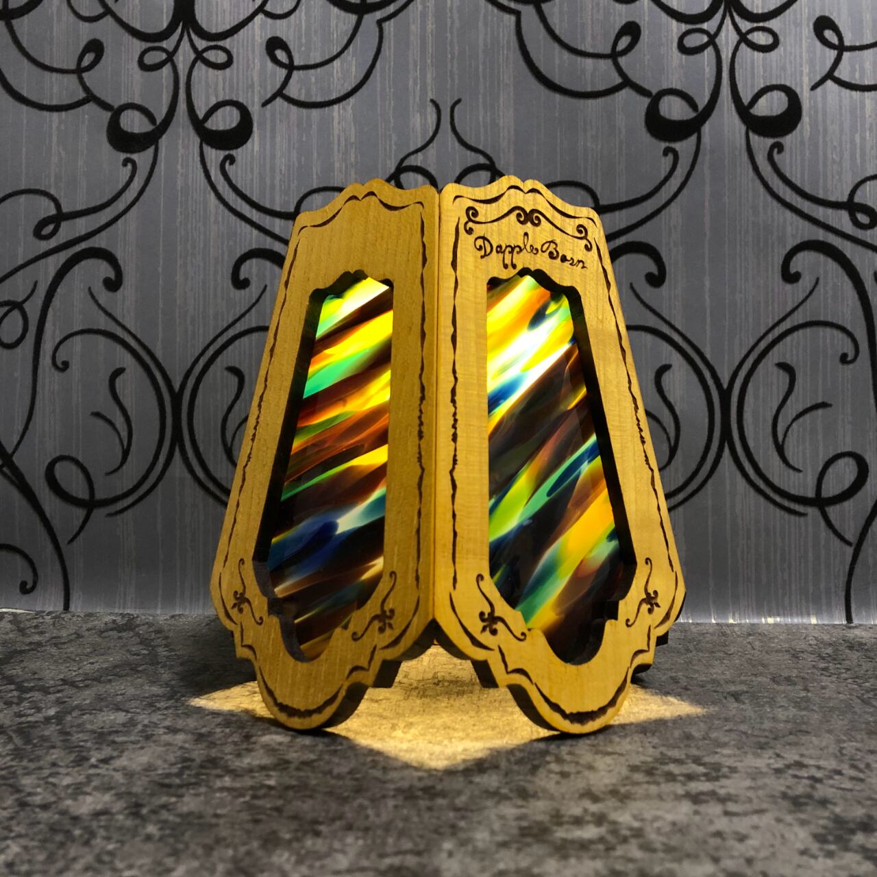ステンドグラスの部分は交換できる仕様になってますので、テントコーデに合わせて変更できます。ガラスはトンボで固定されているので、持ち運ぶ際はガラスを外して運べます。