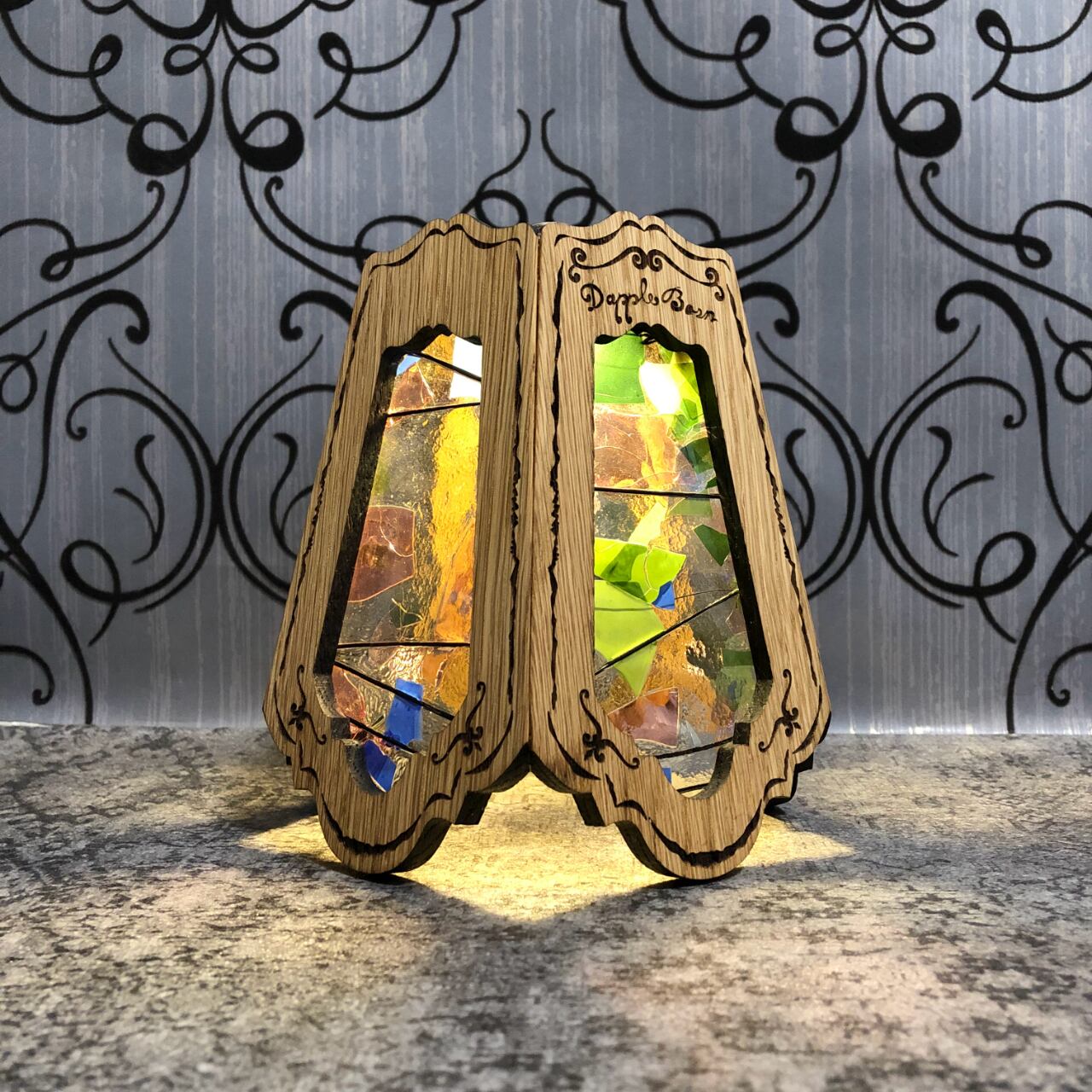 ステンドグラスの部分は交換できる仕様になってますので、テントコーデに合わせて変更できます。ガラスはトンボで固定されているので、持ち運ぶ際はガラスを外して運べます。
