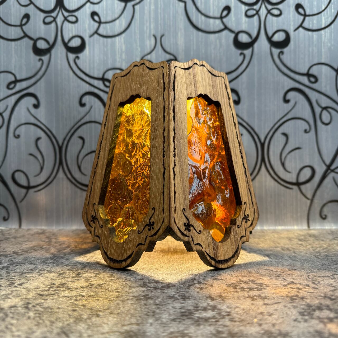 ステンドグラスの部分は交換できる仕様になってますので、テントコーデに合わせて変更できます。ガラスはトンボで固定されているので、持ち運ぶ際はガラスを外して運べます。