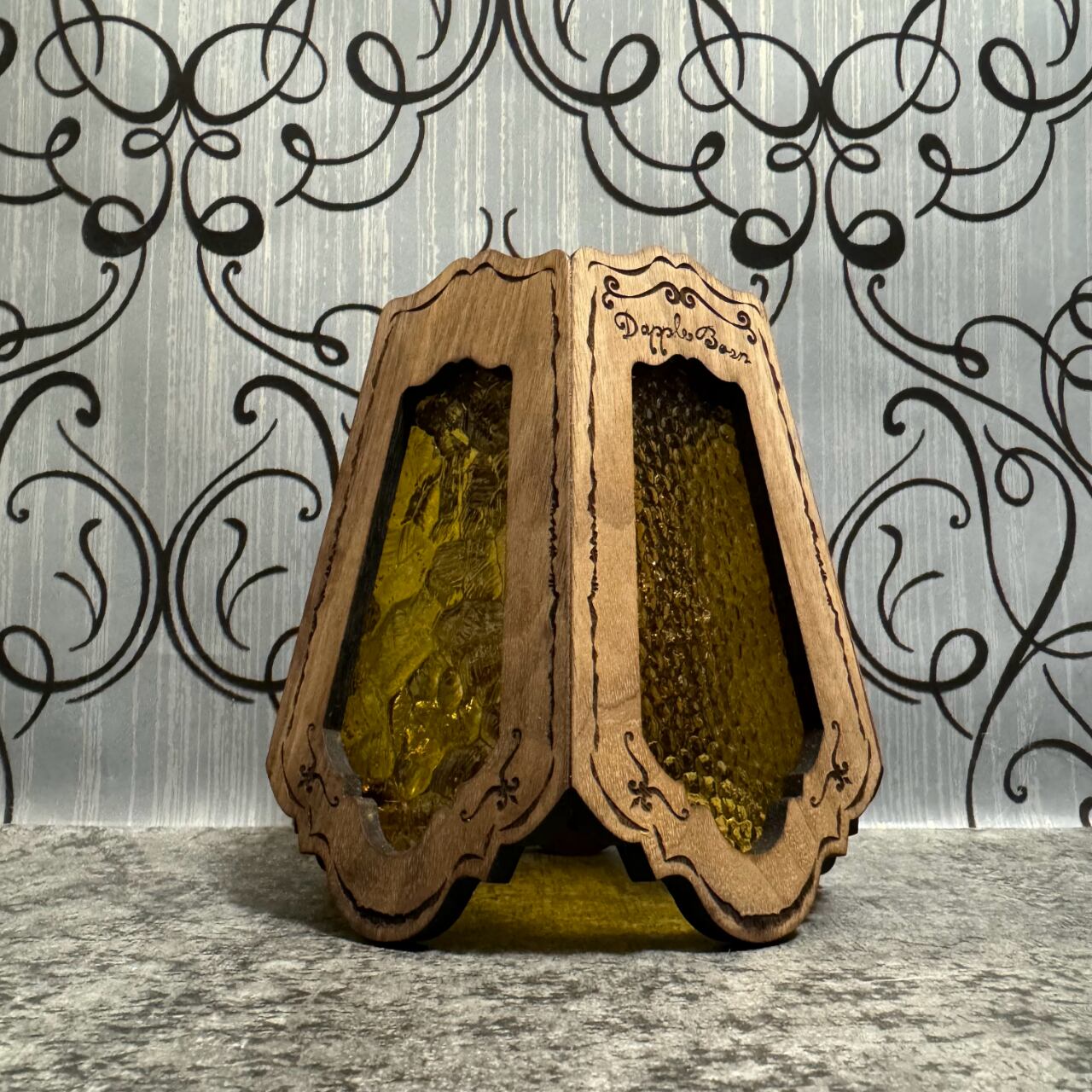 ステンドグラスの部分は交換できる仕様になってますので、テントコーデに合わせて変更できます。ガラスはトンボで固定されているので、持ち運ぶ際はガラスを外して運べます。