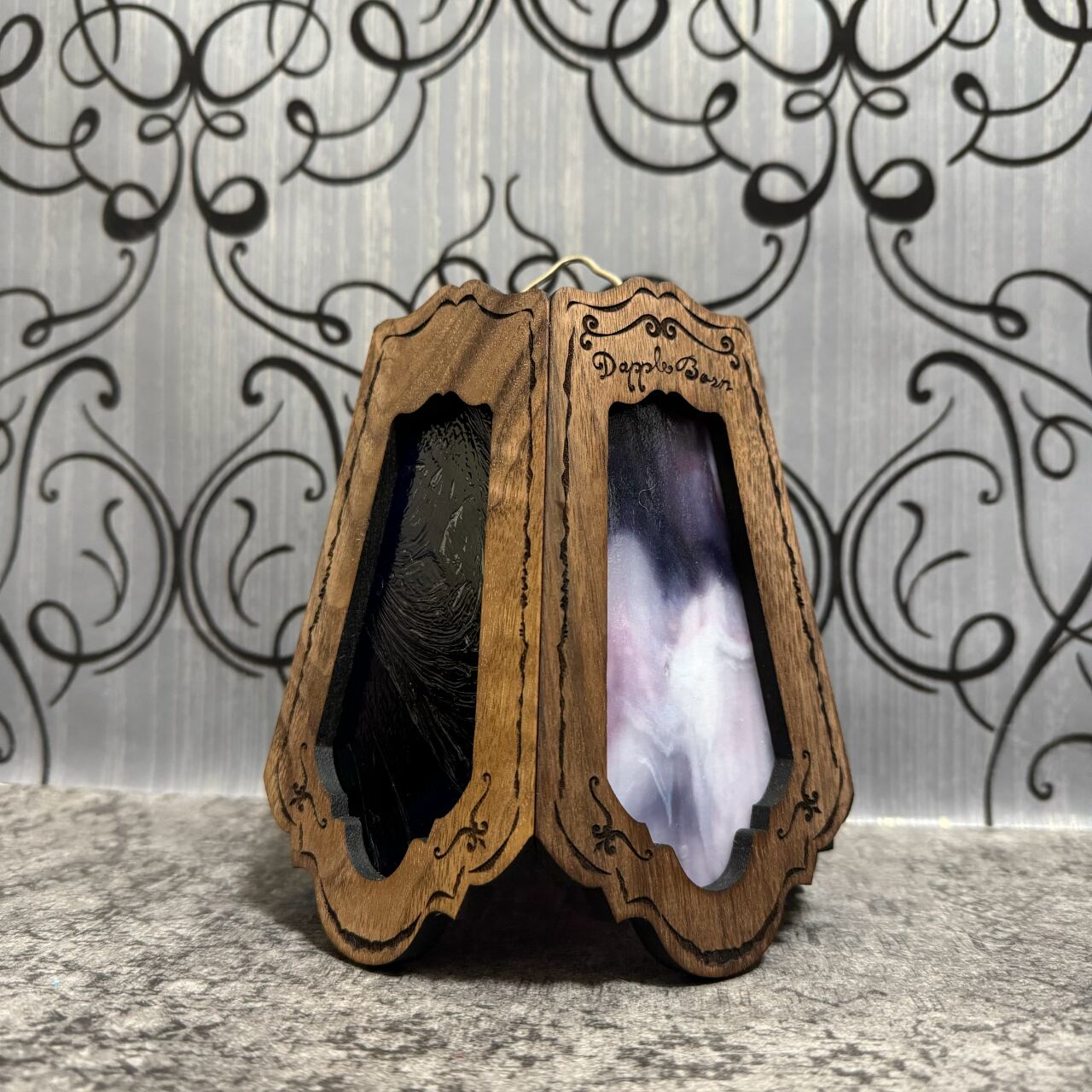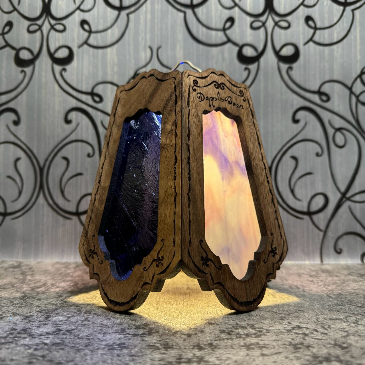 ステンドグラスの部分は交換できる仕様になってますので、テントコーデに合わせて変更できます。ガラスはトンボで固定されているので、持ち運ぶ際はガラスを外して運べます。