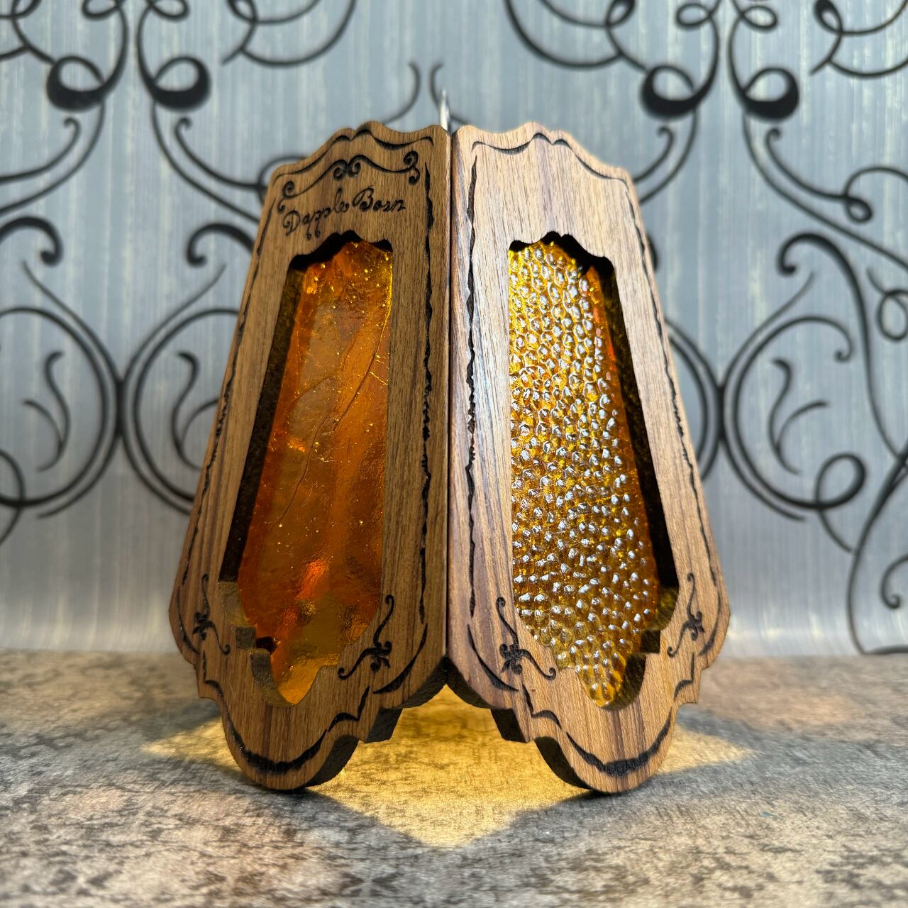 ステンドグラスの部分は交換できる仕様になってますので、テントコーデに合わせて変更できます。ガラスはトンボで固定されているので、持ち運ぶ際はガラスを外して運べます。