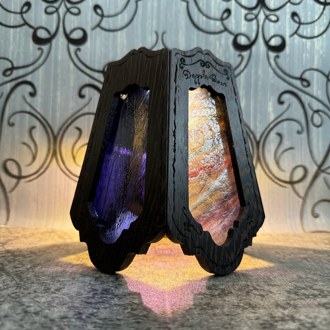 ステンドグラスの部分は交換できる仕様になってますので、テントコーデに合わせて変更できます。ガラスはトンボで固定されているので、持ち運ぶ際はガラスを外して運べます。