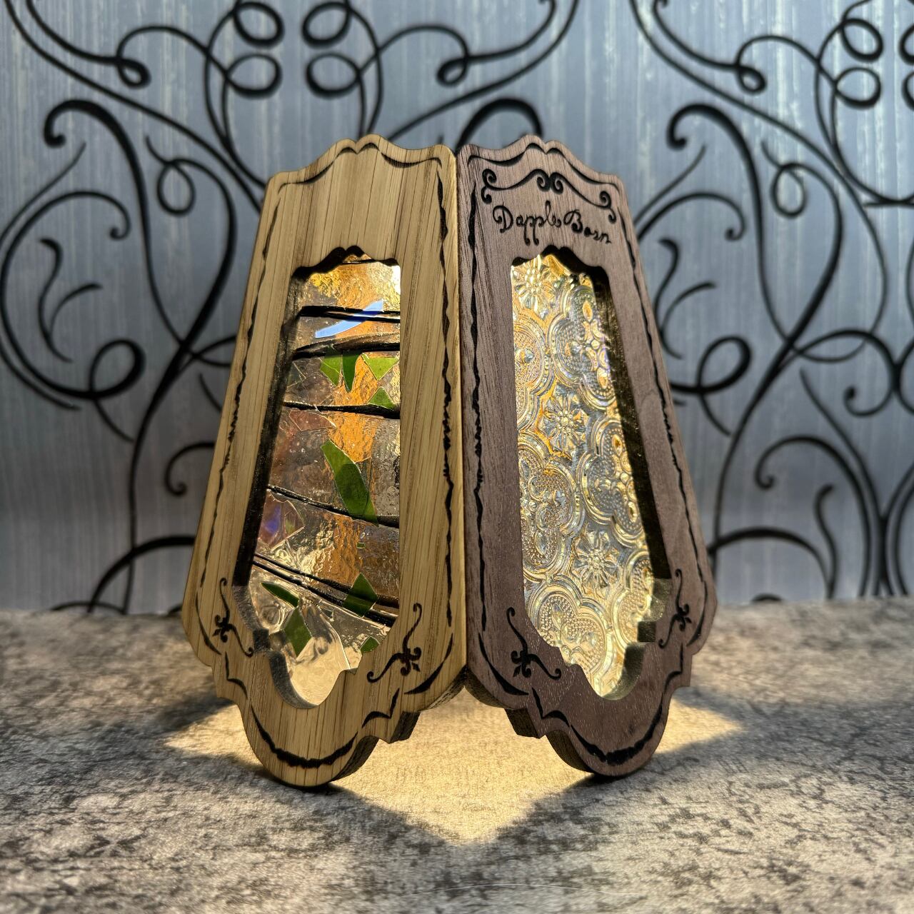 ステンドグラスの部分は交換できる仕様になってますので、テントコーデに合わせて変更できます。ガラスはトンボで固定されているので、持ち運ぶ際はガラスを外して運べます。