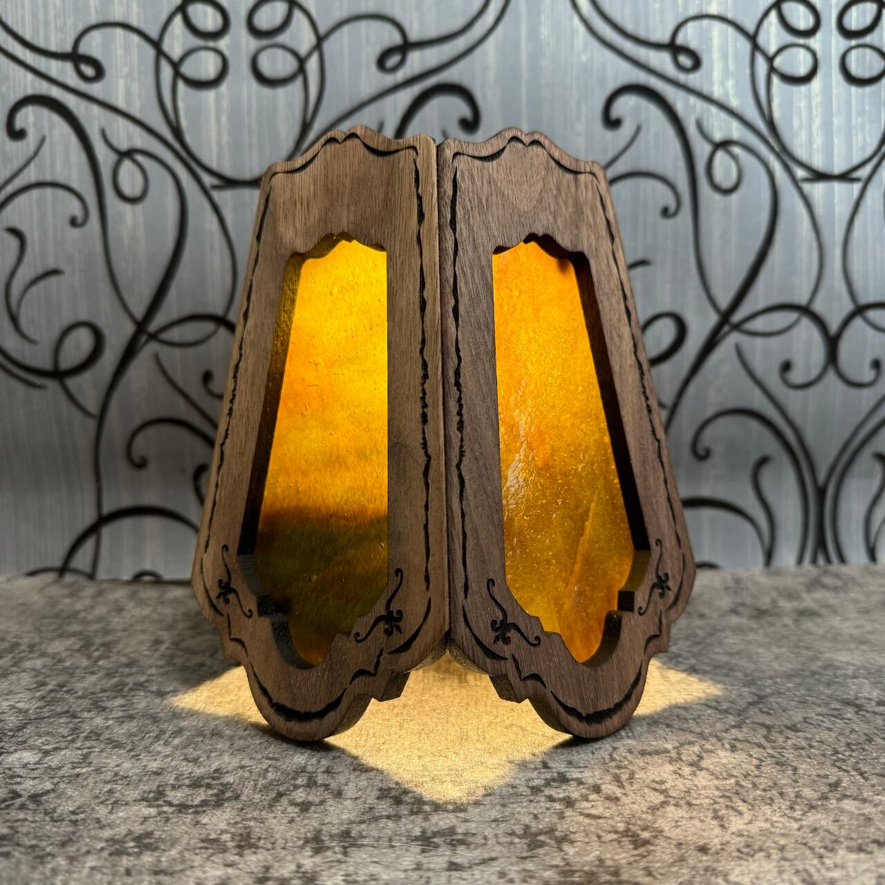ステンドグラスの部分は交換できる仕様になってますので、テントコーデに合わせて変更できます。ガラスはトンボで固定されているので、持ち運ぶ際はガラスを外して運べます。