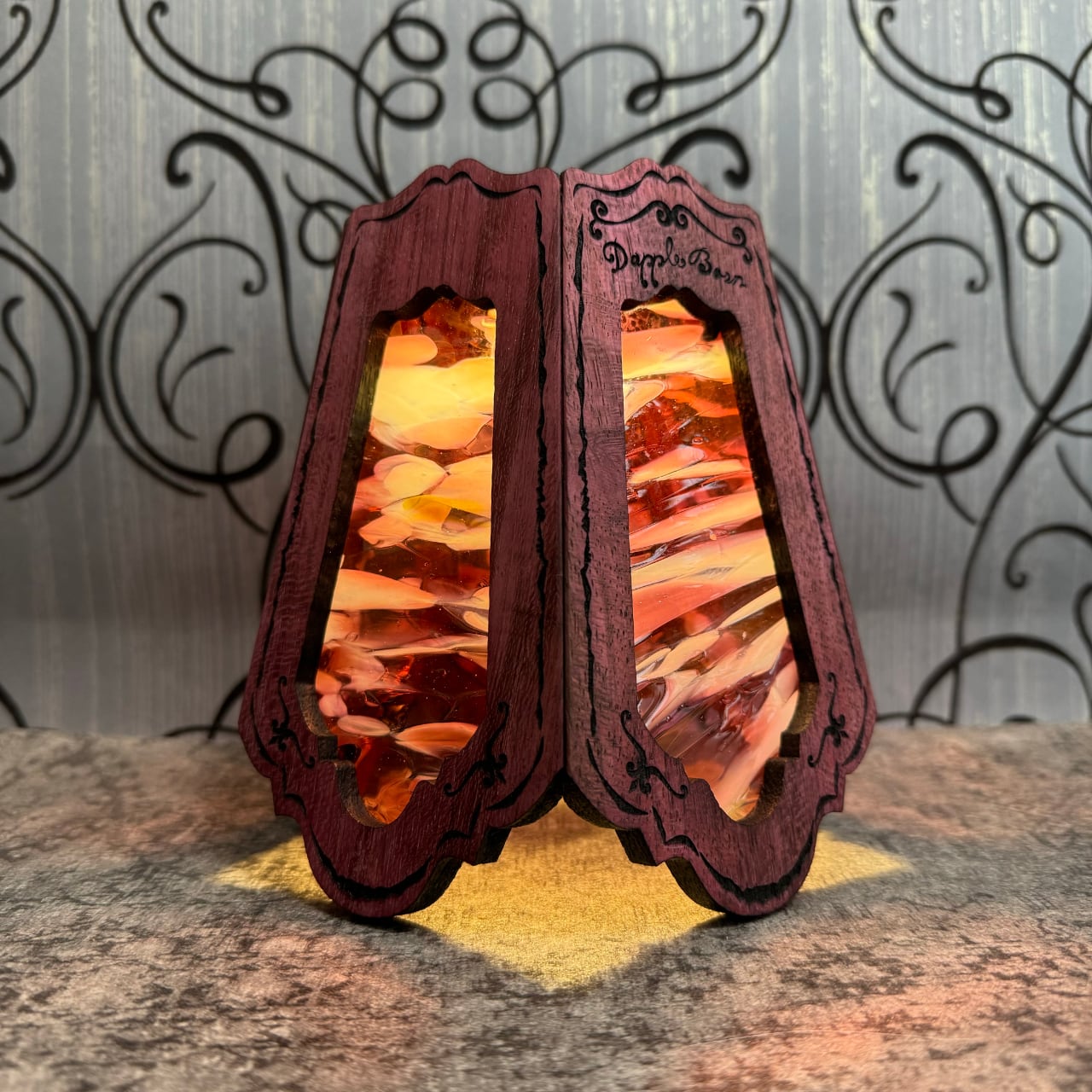 ステンドグラスの部分は交換できる仕様になってますので、テントコーデに合わせて変更できます。ガラスはトンボで固定されているので、持ち運ぶ際はガラスを外して運べます。