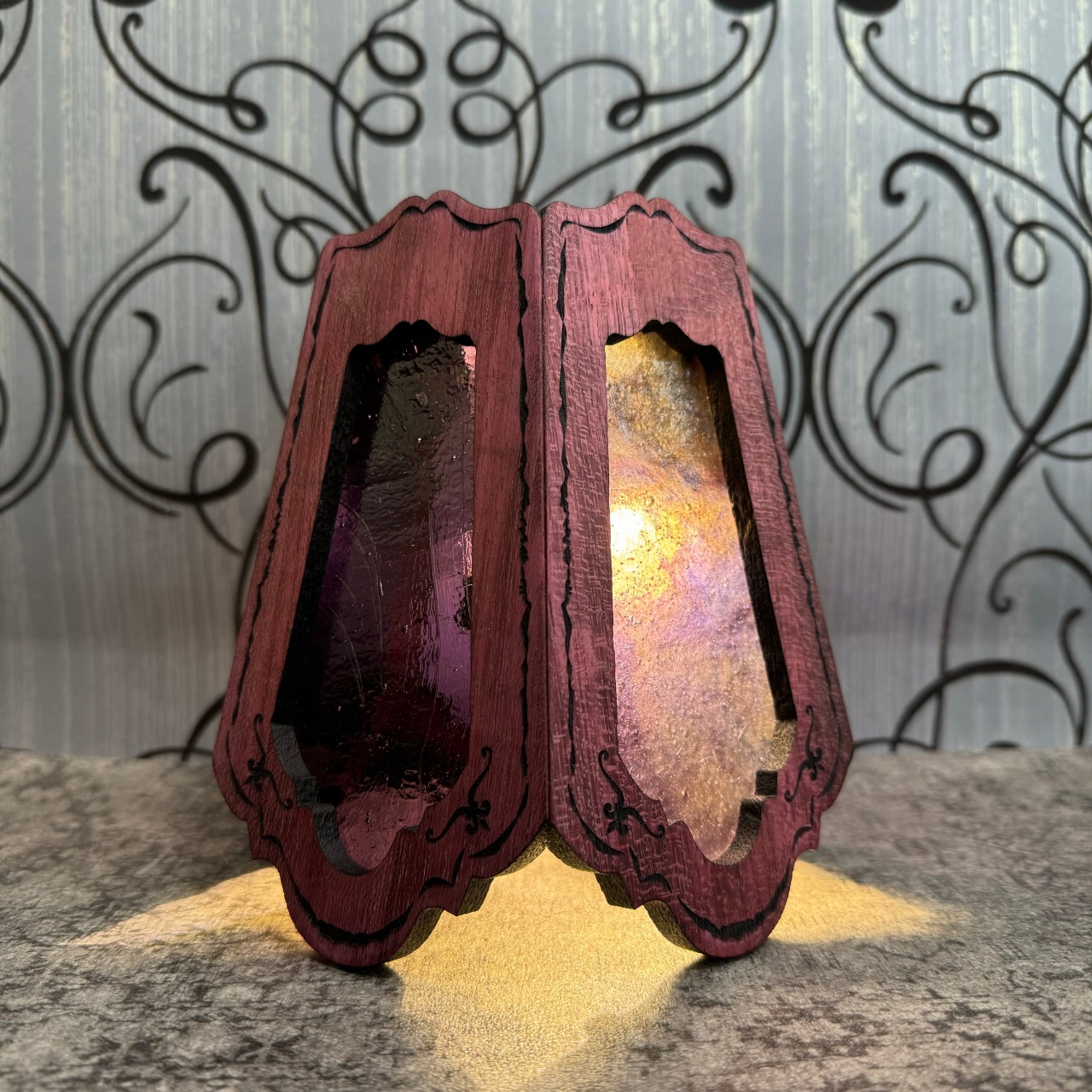 ステンドグラスの部分は交換できる仕様になってますので、テントコーデに合わせて変更できます。ガラスはトンボで固定されているので、持ち運ぶ際はガラスを外して運べます。