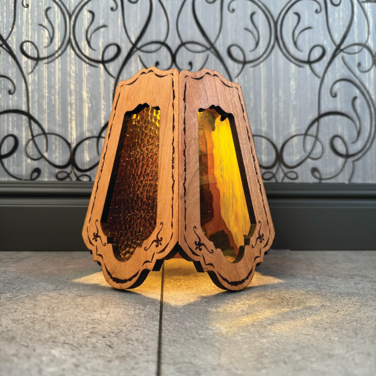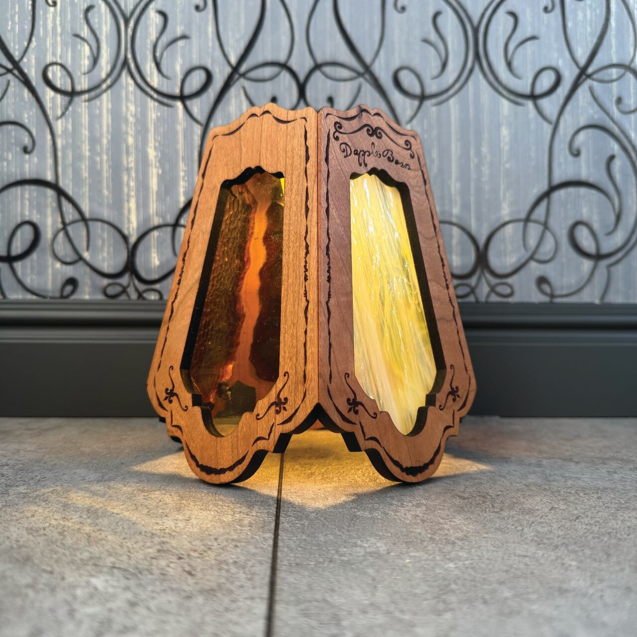 ステンドグラスの部分は交換できる仕様になってますので、テントコーデに合わせて変更できます。ガラスはトンボで固定されているので、持ち運ぶ際はガラスを外して運べます。