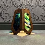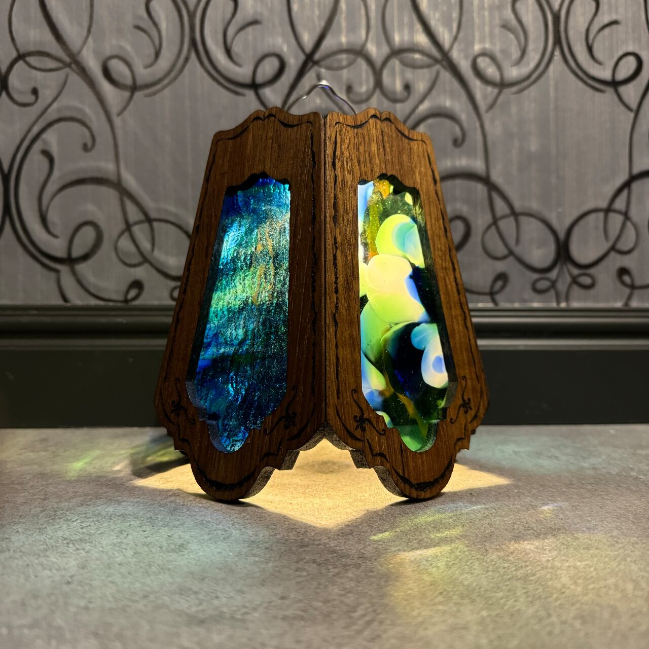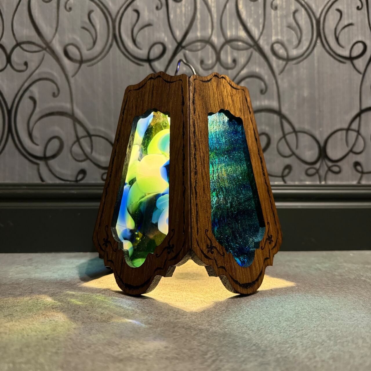 ステンドグラスの部分は交換できる仕様になってますので、テントコーデに合わせて変更できます。ガラスはトンボで固定されているので、持ち運ぶ際はガラスを外して運べます。