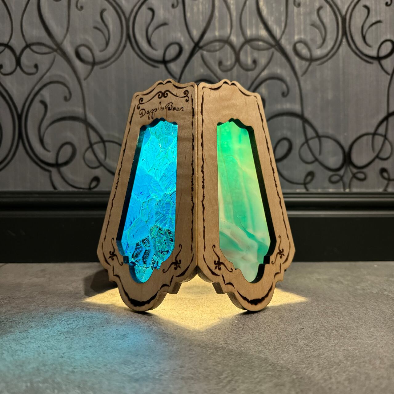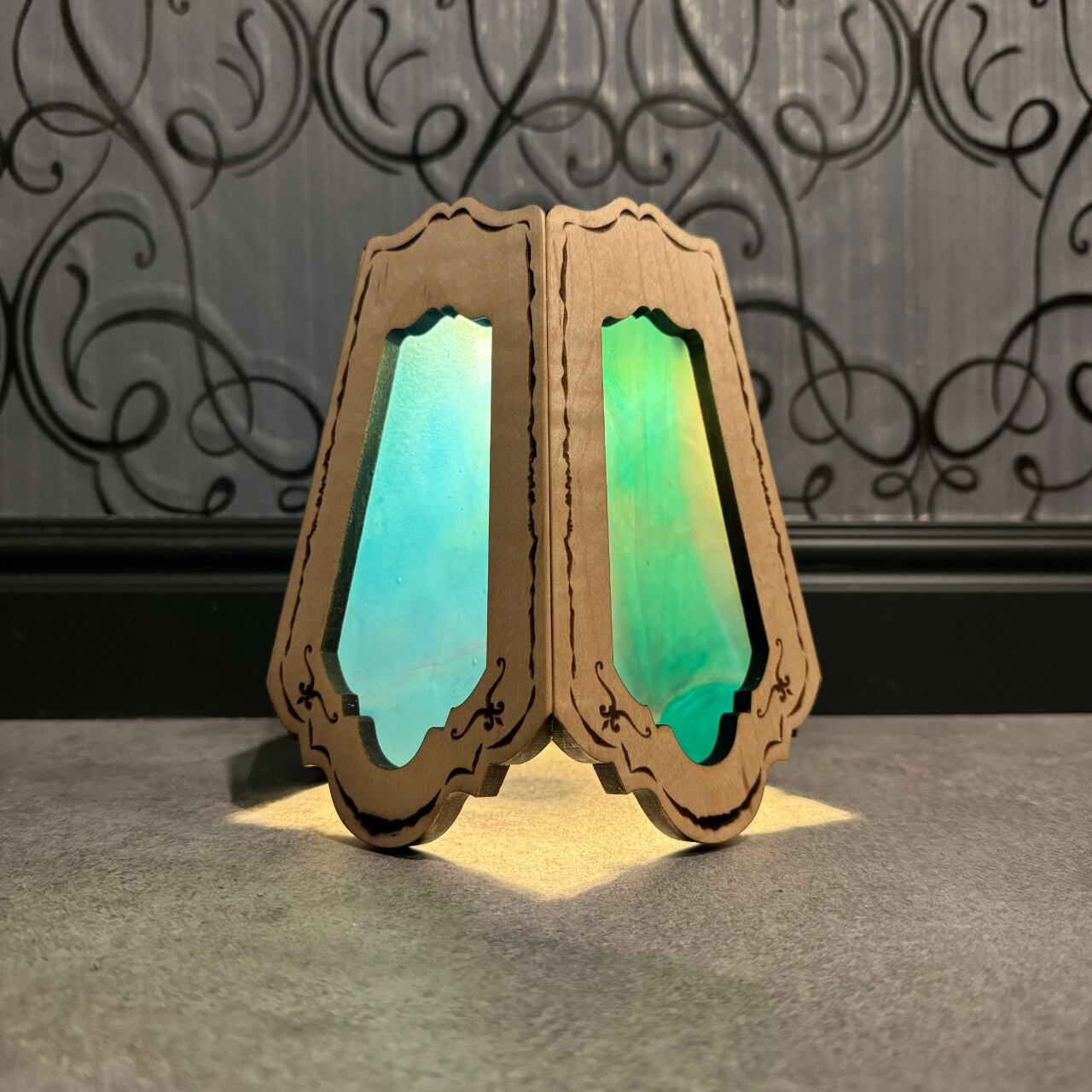 ステンドグラスの部分は交換できる仕様になってますので、テントコーデに合わせて変更できます。ガラスはトンボで固定されているので、持ち運ぶ際はガラスを外して運べます。