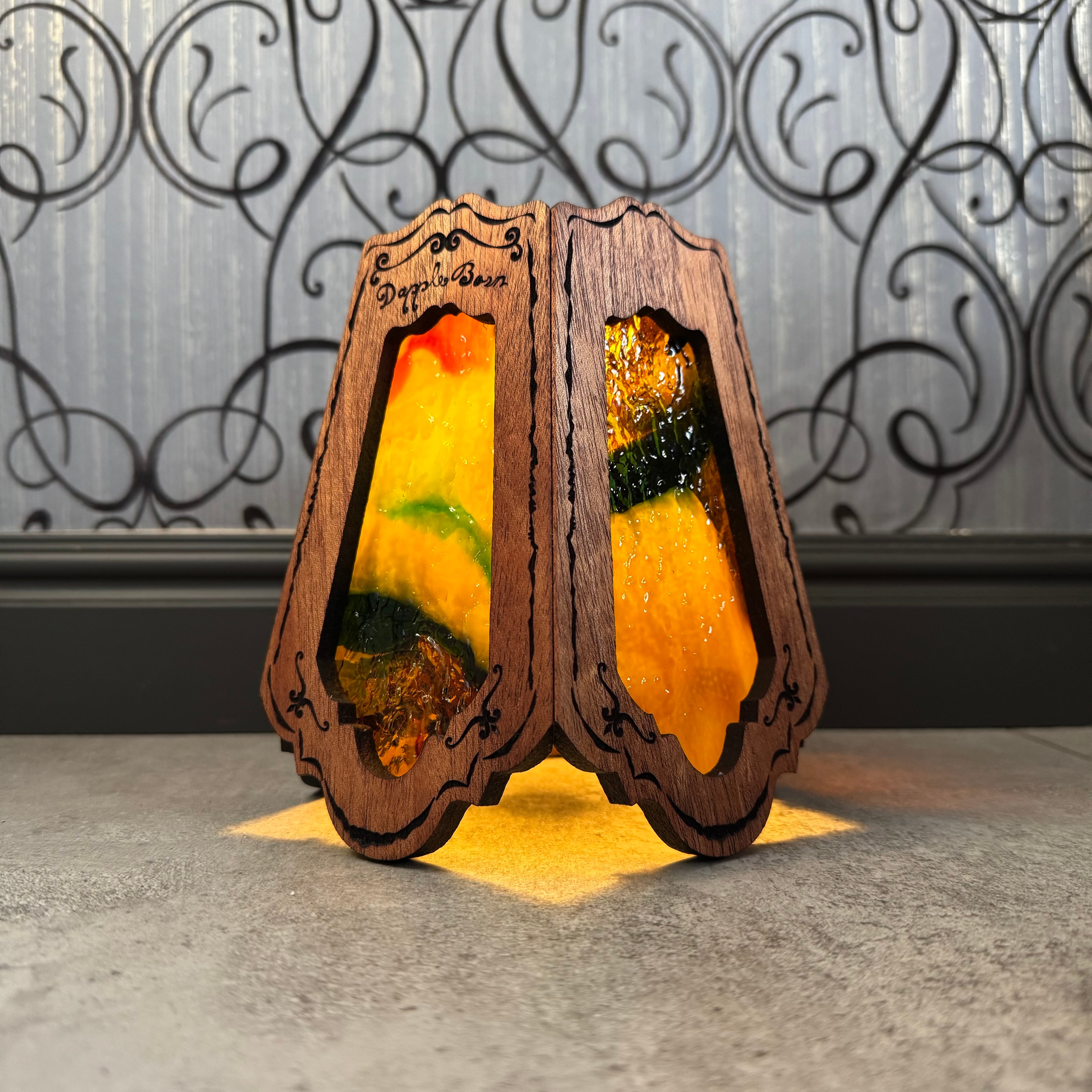 ステンドグラスの部分は交換できる仕様になってますので、テントコーデに合わせて変更できます。ガラスはトンボで固定されているので、持ち運ぶ際はガラスを外して運べます。